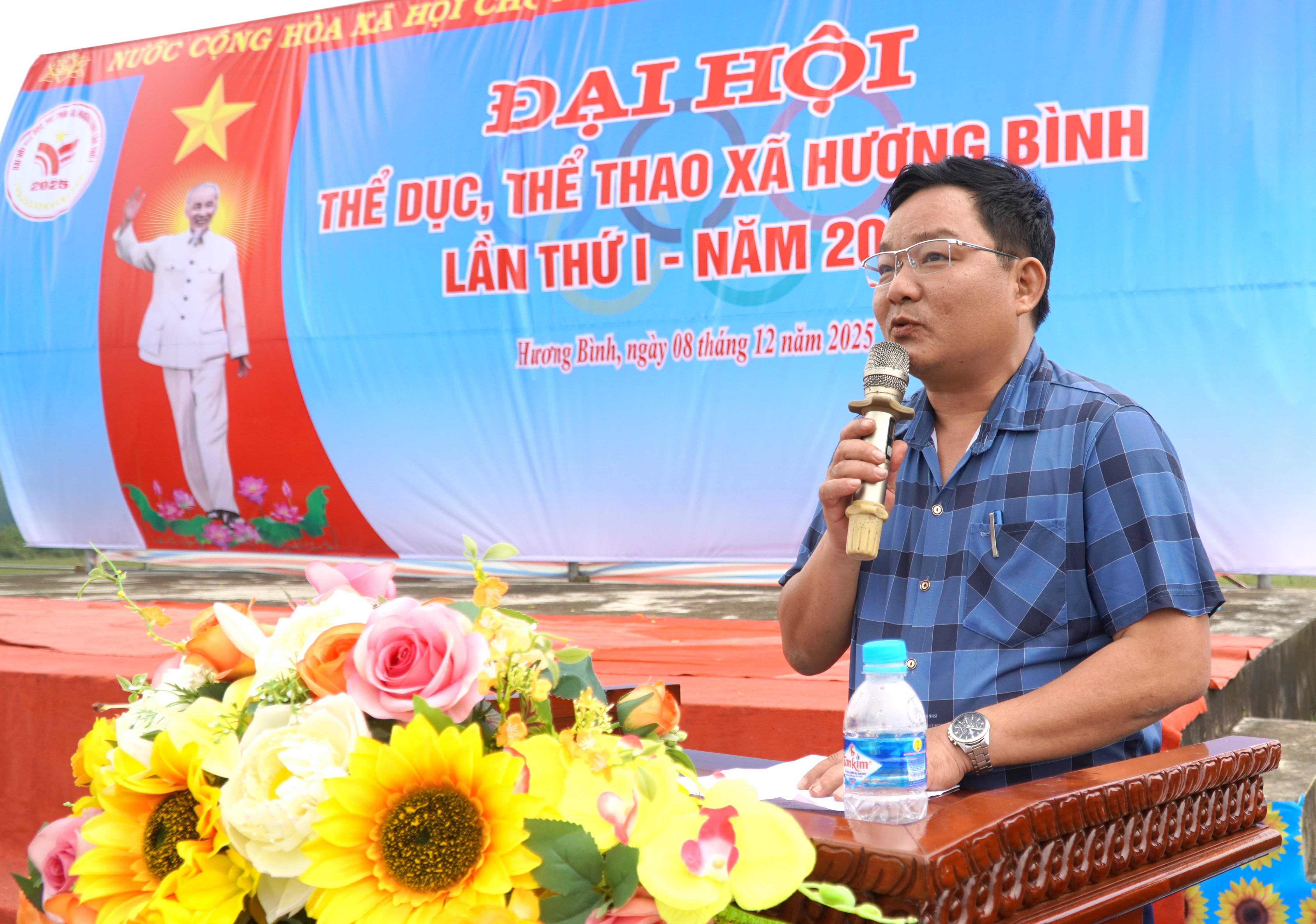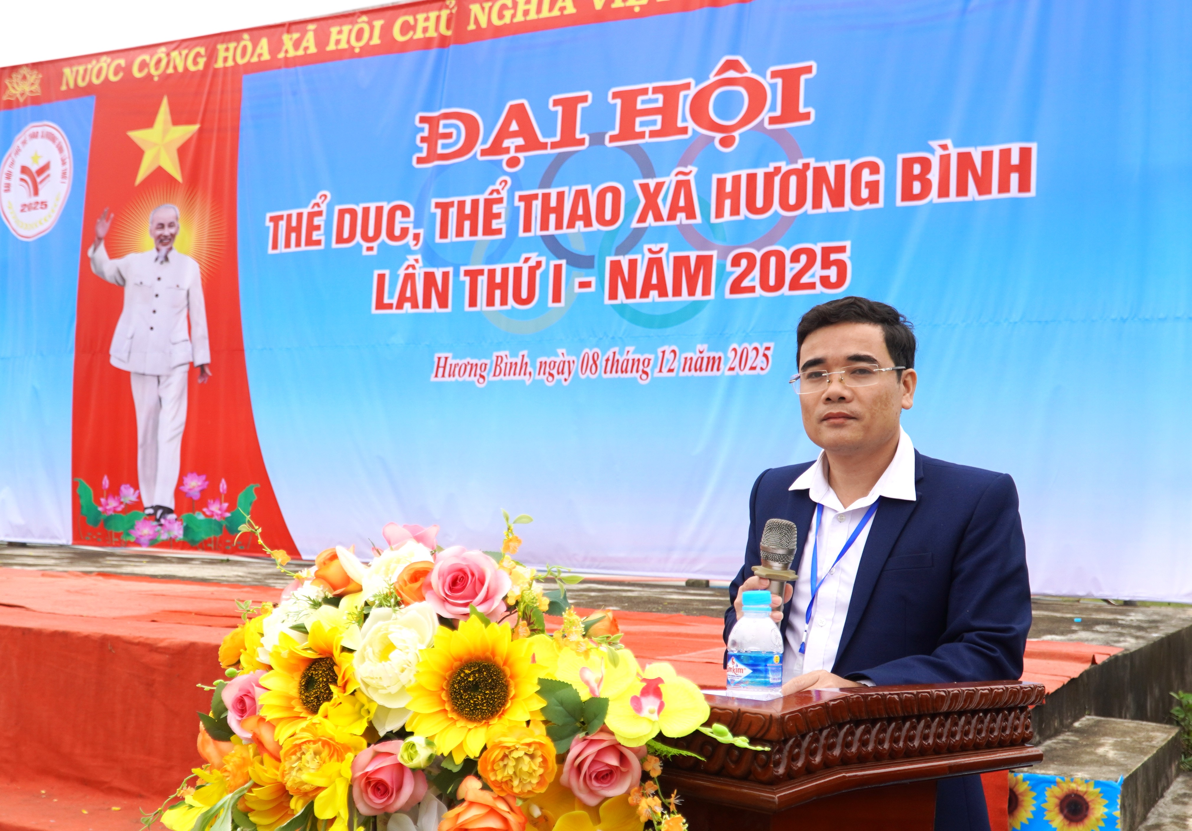 Đồng chí Đặng Quốc Bảo - PCT UBND xã, Trưởng Ban tổ chức Đại hội TDTT xã Hương Bình lần thứ I, năm 2025 bế mạc đại hội.