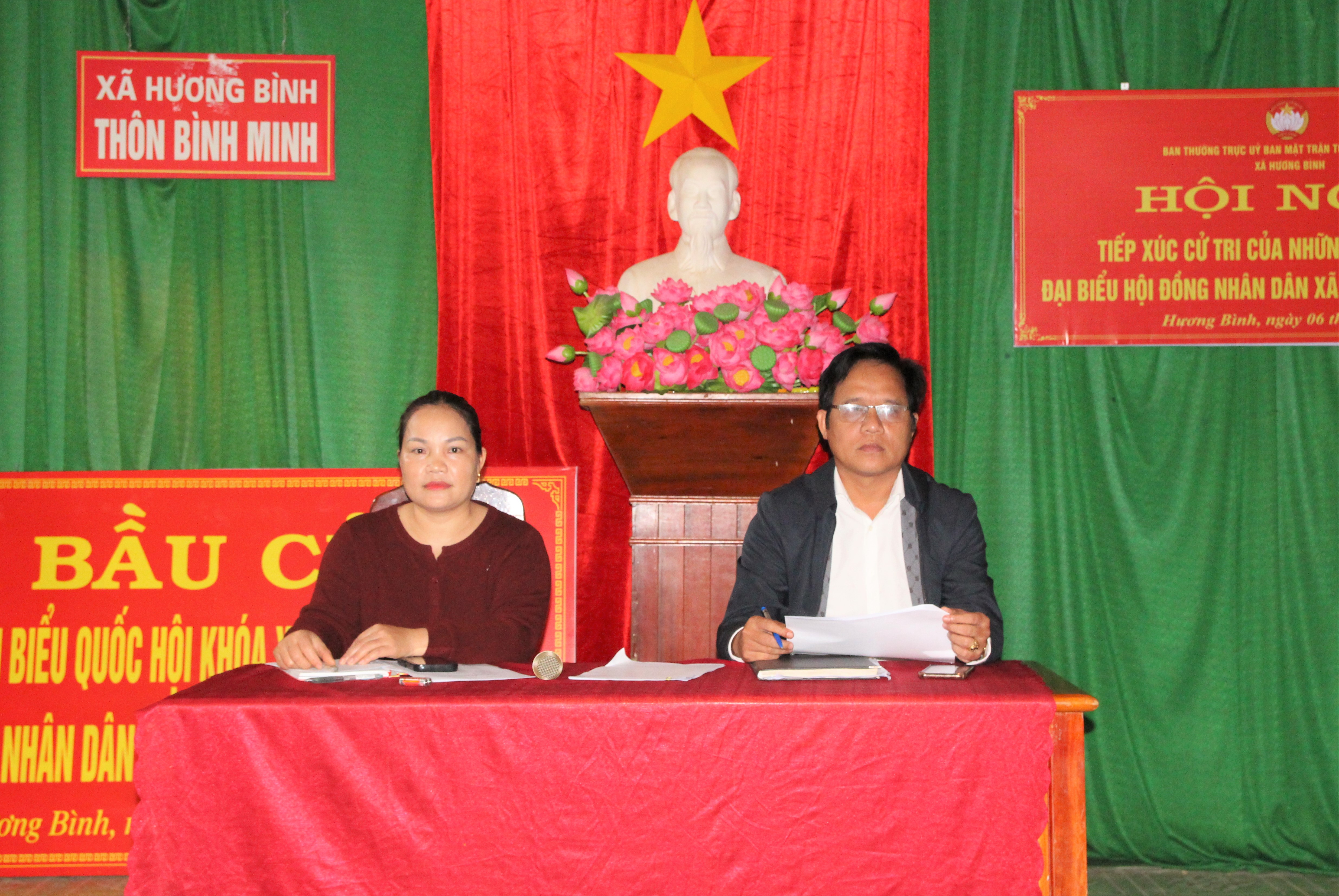 Ông Trần Văn Thường – Chuyên viên Ủy ban MTTQ Việt Nam xã, Phó Chủ tịch Hội Nông dân xã Hương Bình và bà Nguyễn Thị Phương – Trưởng Ban công tác mặt trận thôn Bình Minh chủ trì.