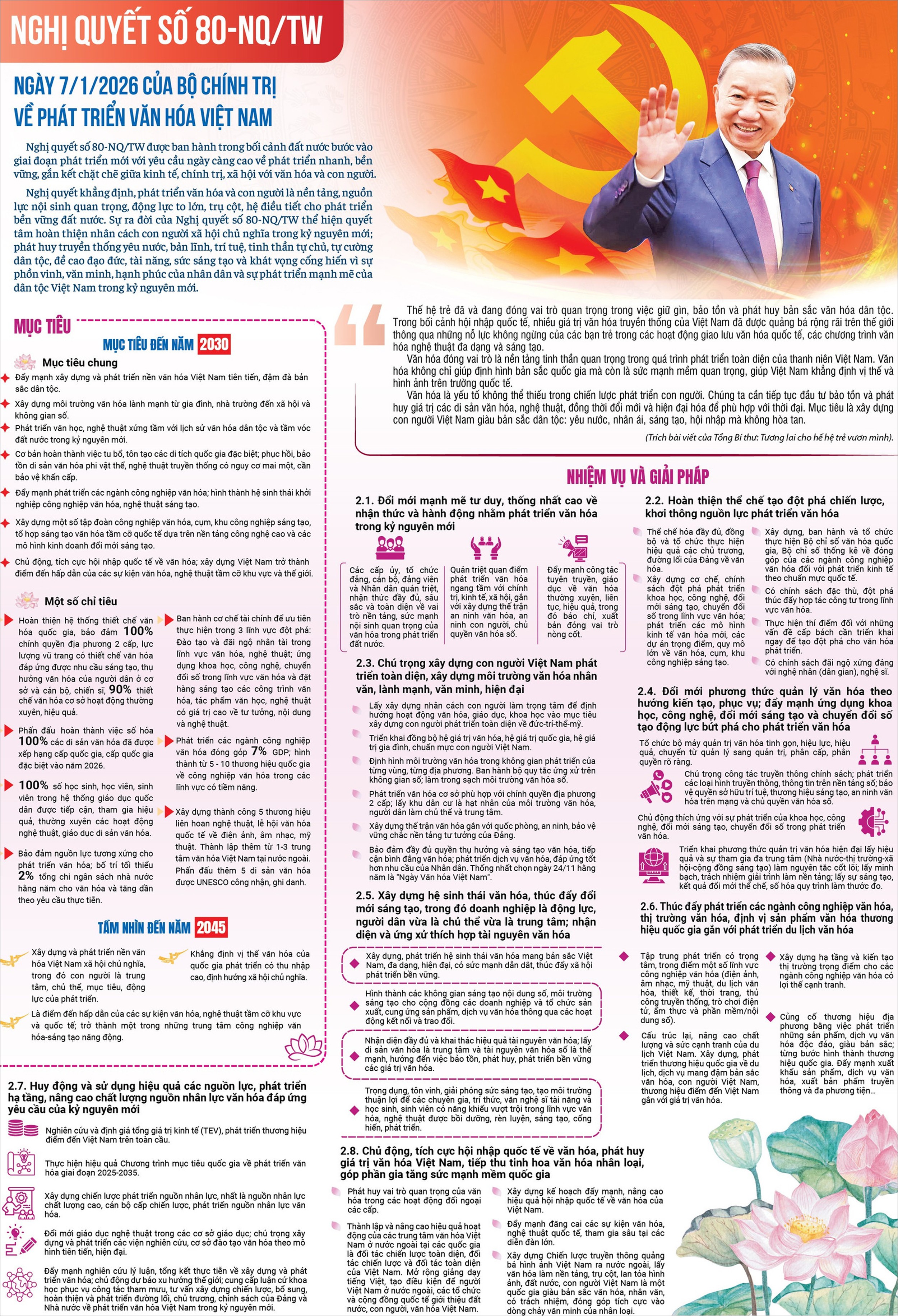 Phát biểu chỉ đạo tại hội nghị, đồng chí Tô Lâm nhấn mạnh ý nghĩa đặc biệt quan trọng của việc ban hành Nghị quyết số 79-NQ/TW về phát triển kinh tế và Nghị quyết số 80-NQ/TW về phát triển văn hóa, coi đây là trụ cột nhằm tăng cường nội lực vật chất, củng cố nền tảng tinh thần cho sự phát triển đất nước.