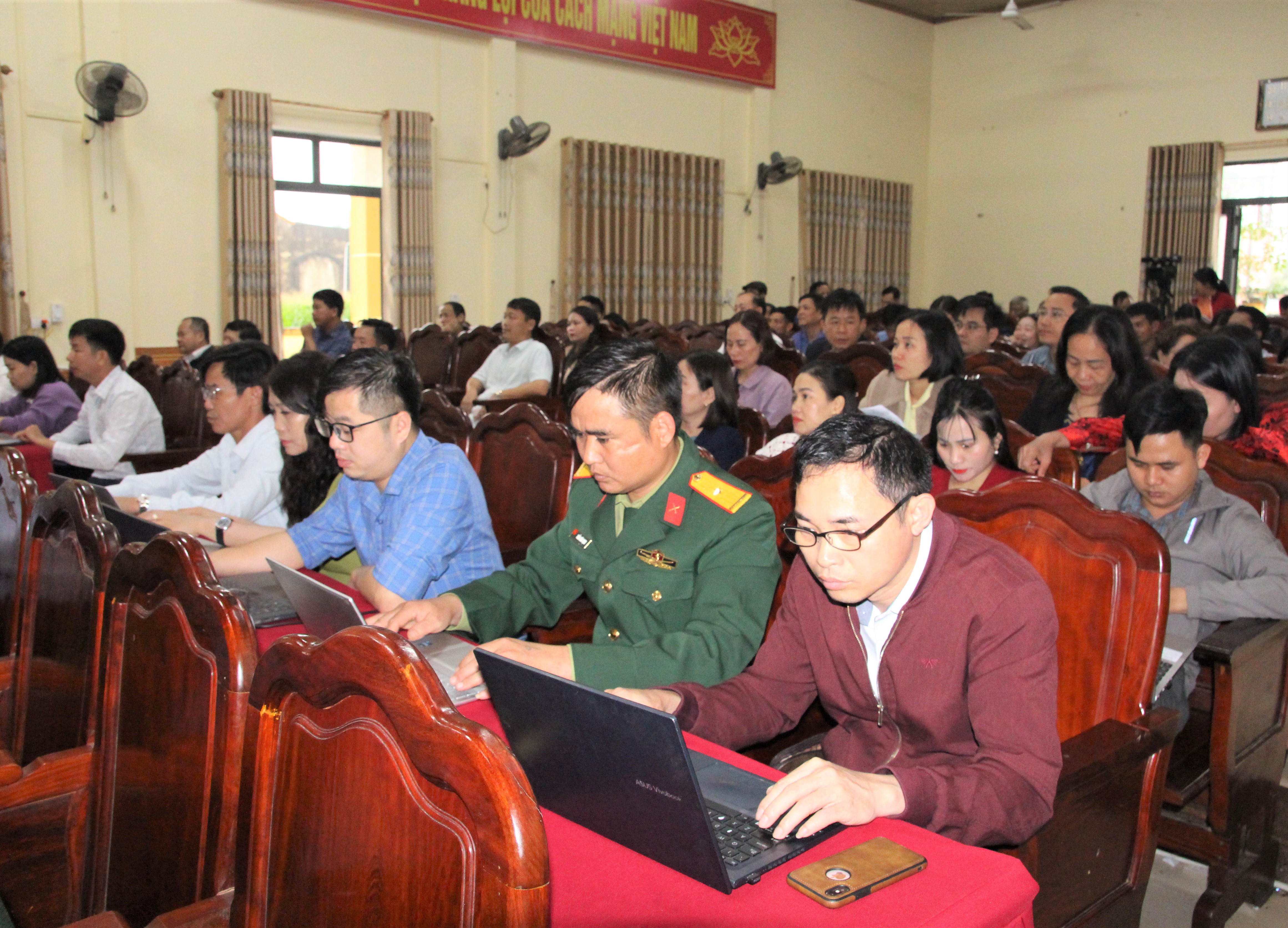 Các đại biểu điểm cầu xã Hương Bình nghiêm túc học tập, tiếp thu và nghiên cứu các Nghị quyết.