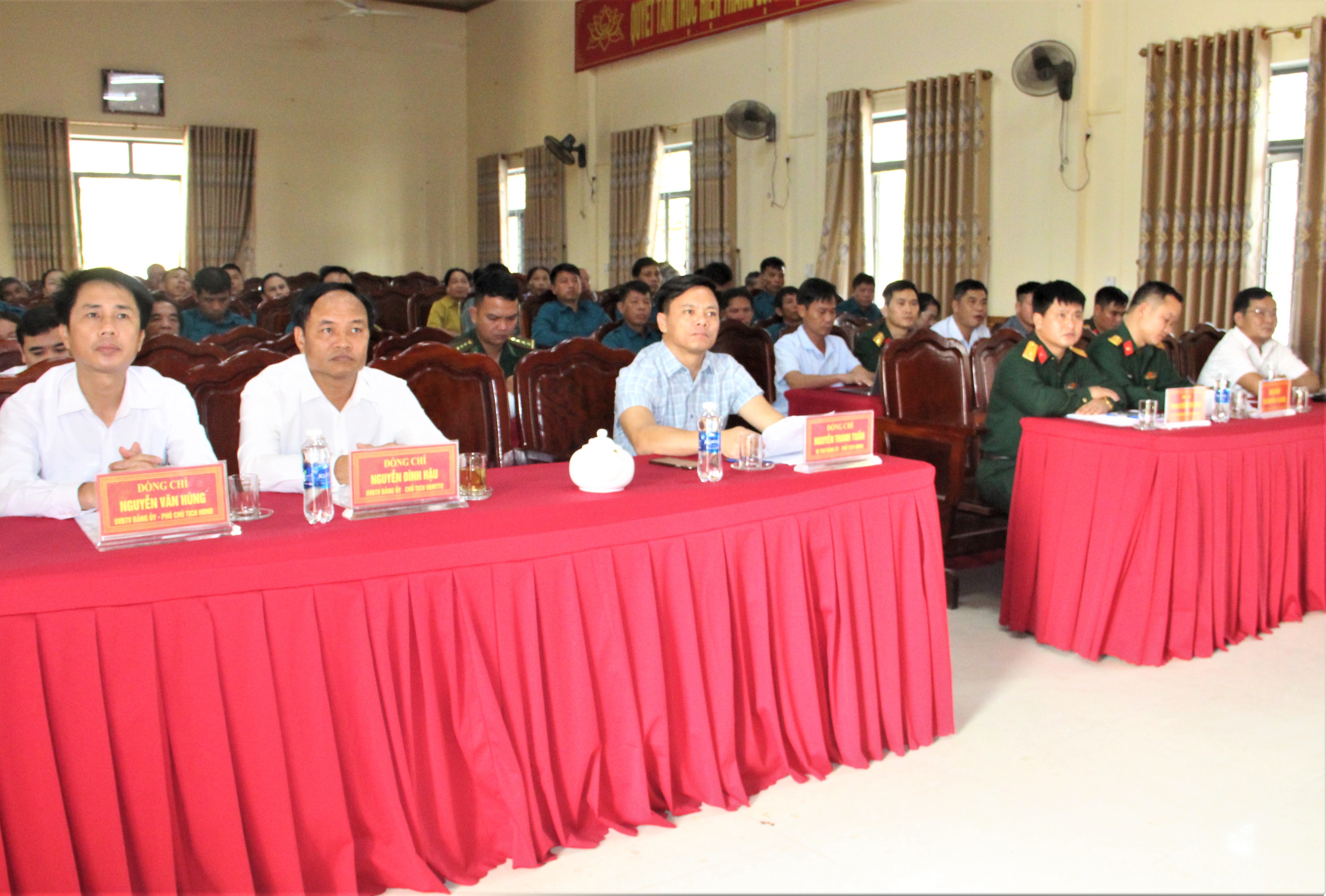 Đồng chí Lê Quang Vinh – Phó Bí thư Đảng ủy, Chủ tịch UBND xã, Chủ tịch Hội đồng nghĩa vụ Quân sự xã; Trần Văn Chính – Ủy viên Ban Thường vụ Đảng ủy, Chỉ huy trưởng Ban chỉ huy Quân sự xã chủ trì hội nghị.