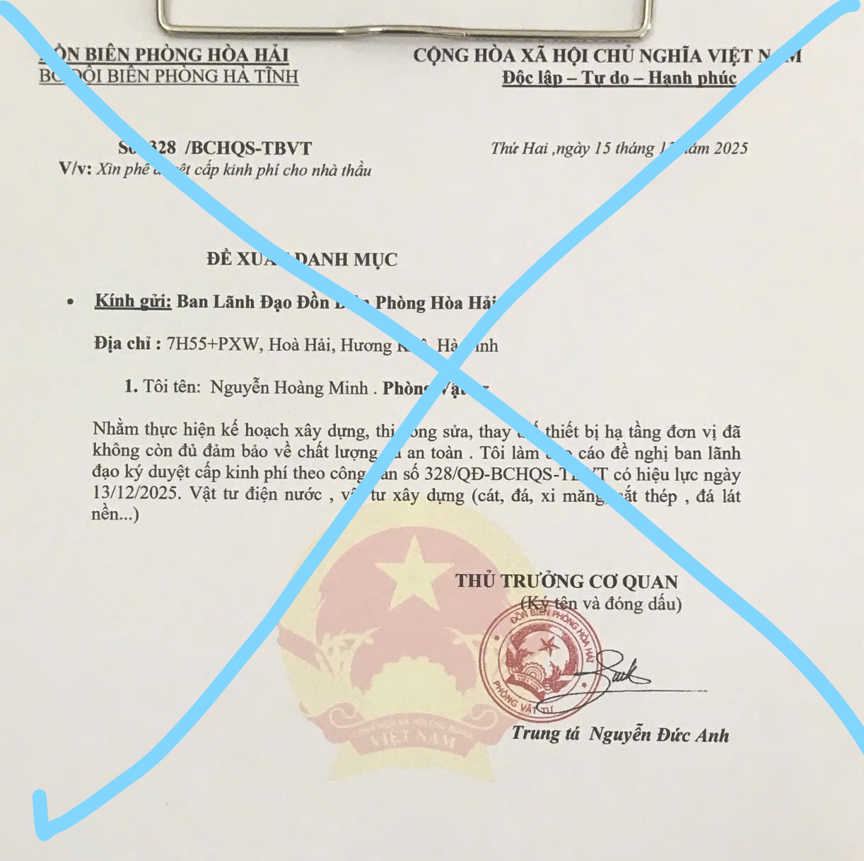 Tại văn bản này có ghi “Nhằm thực hiện kế hoạch xây dựng, thi công sữa chữa, thay thế thiết bị hạ tầng đơn vị, đã không còn đủ đảm bảo về chất lượng và an toàn. Tôi làm báo cáo đề nghị ban lãnh đạo ký duyệt cấp kinh phí theo công văn số 328/QĐ - BCHQS – TBVT có hiệu lực ngày 13/12/2025. Vật tư điện nước, vật tư xây dựng…”