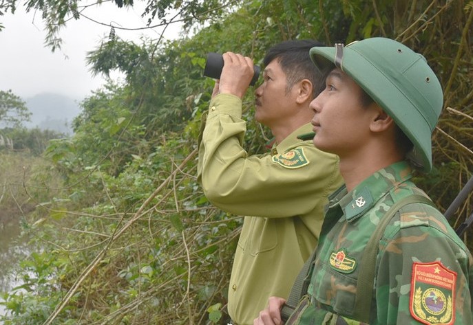 Cán bộ Trạm BVR Hòa Hải phối hợp lực lượng biên phòng tuần tra biên giới, địa bàn kết hợp canh gác, theo dõi cháy rừng. (Ảnh tư liệu)