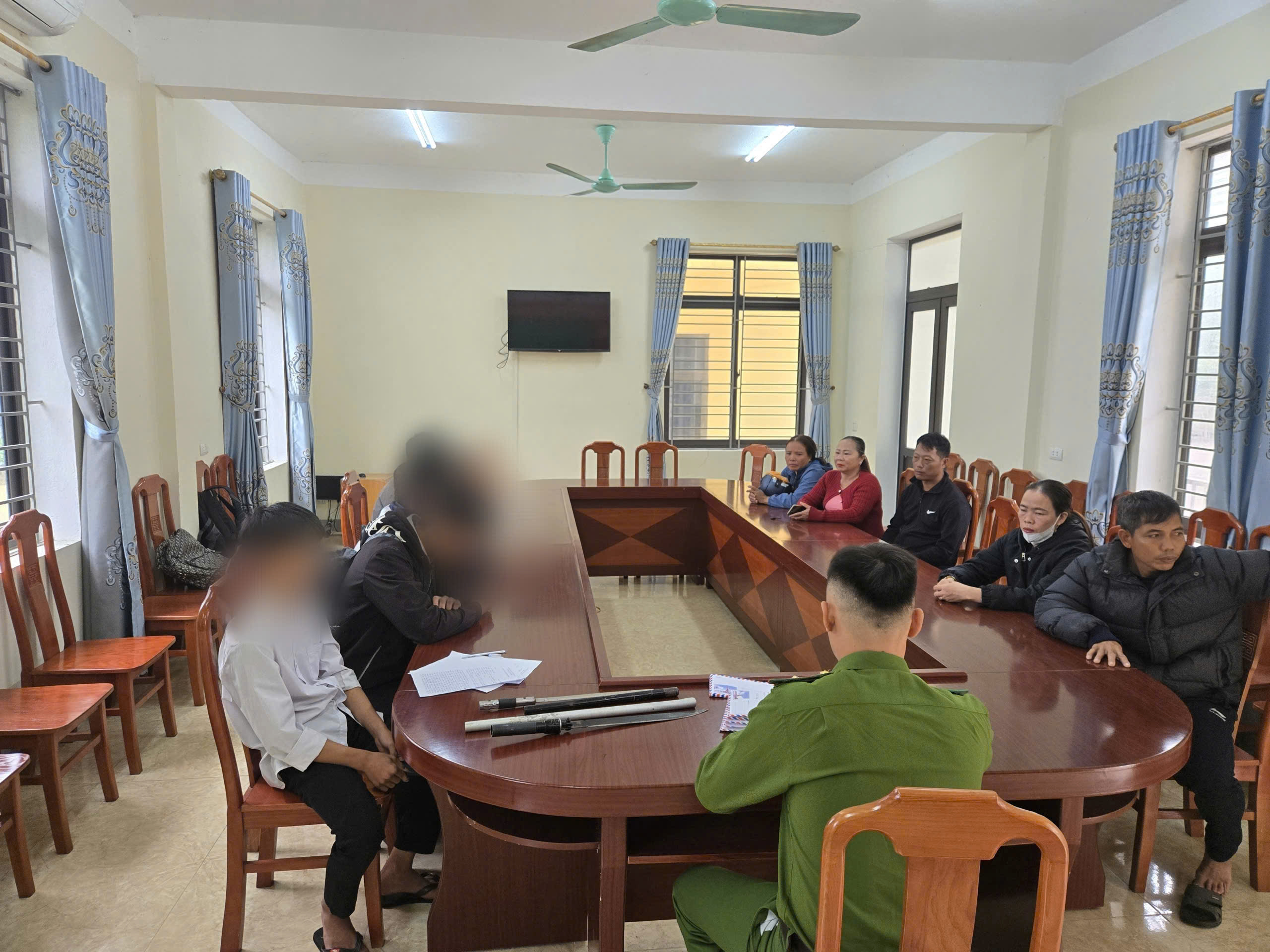Ảnh các đối tượng cùng hung khí tự chế tại Công an xã