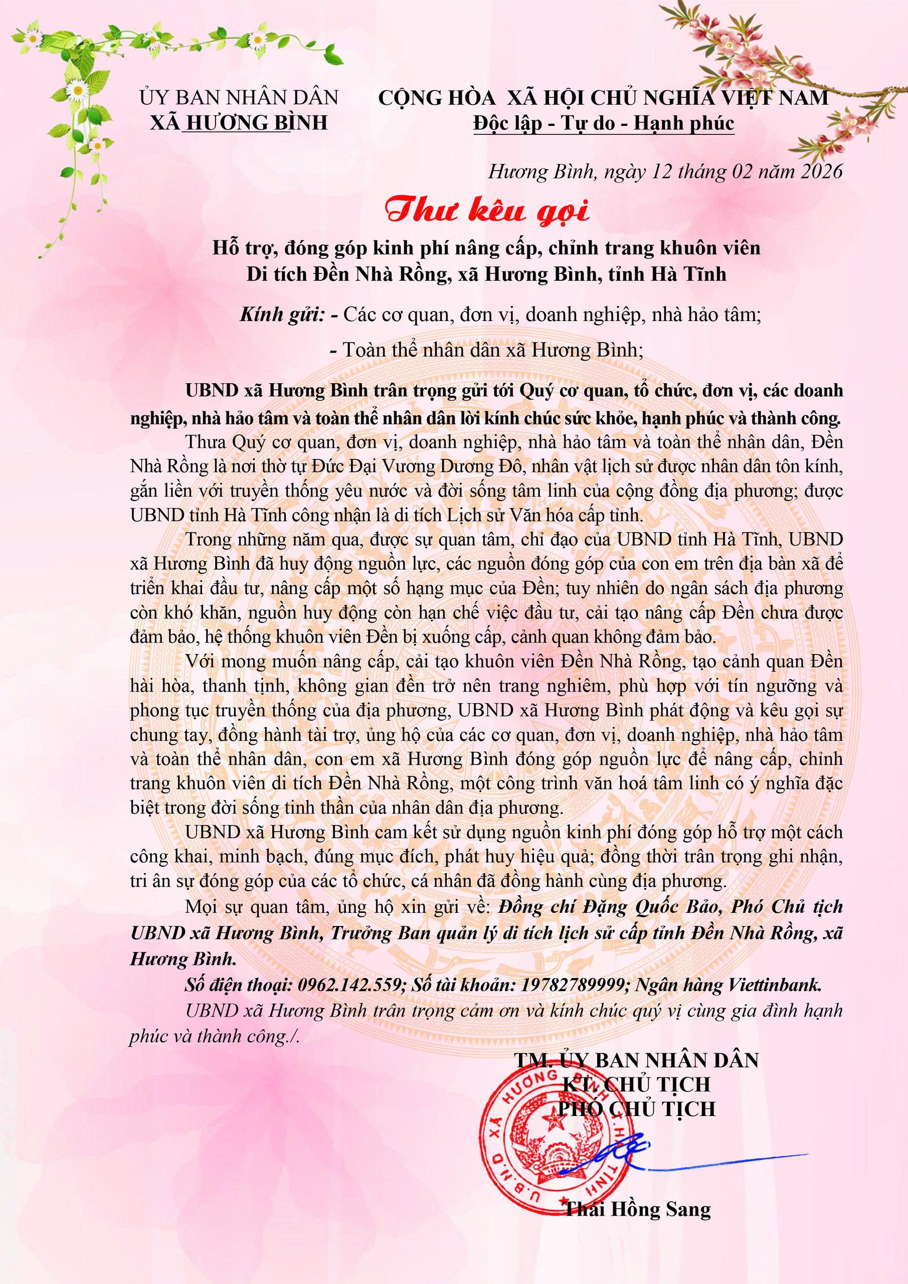Để thực hiện việc này, Cán bộ và nhân dân xã Hương Bình rất cần sự chung tay, đồng hành tài trợ, ủng hộ của các cơ quan, đơn vị, doanh nghiệp, nhà hảo tâm và toàn thể nhân dân, con em xã Hương Bình đóng góp nguồn lực để nâng cấp, chỉnh trang khuôn viên di tích Đền Nhà Rồng.