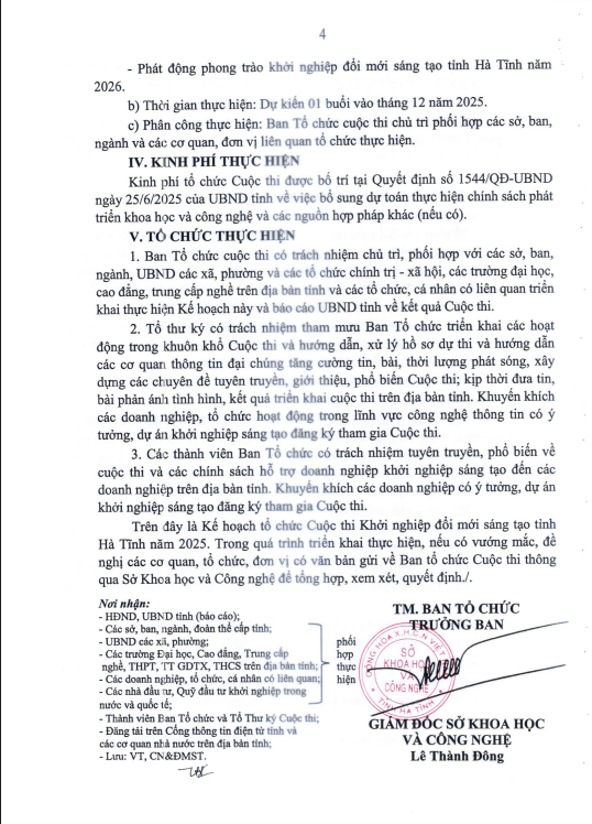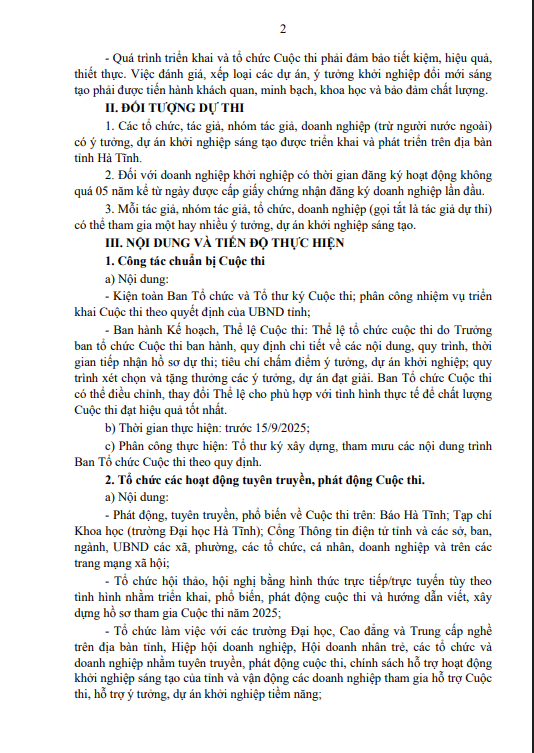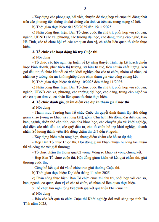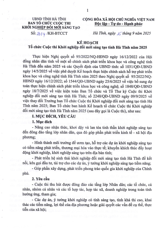 ngày 18/7/2025 về việc kiện toàn Ban Tổ chức và Tổ Thư ký Cuộc thi Khởi nghiệp đổi mới sáng tạo tỉnh Hà Tĩnh; số 2248/QĐ-UBND ngày 09/9/2025 về việc thay đổi Trưởng ban Tổ chức Cuộc thi Khởi nghiệp đổi mới sáng tạo tỉnh Hà Tĩnh năm 2025; Ban Tổ chức ban hành Kế hoạch tổ chức Cuộc thi Khởi nghiệp đổi mới sáng tạo tỉnh Hà Tĩnh năm 2025 (sau đây gọi là Cuộc thi), như sau: