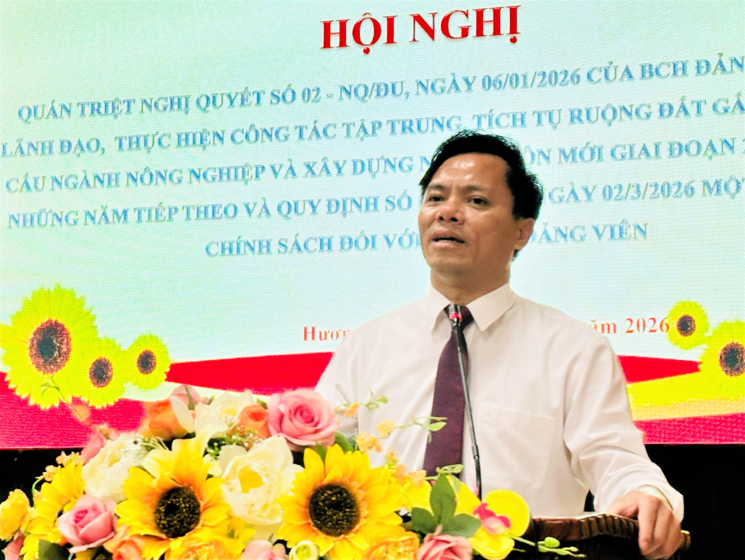 Tại hội nghị, các đại biểu đã được nghe đồng chí Đoàn Thanh Hải – Phó Bí thư Thường trực Đảng ủy xã quán triệt nội dung Nghị quyết số 02-NQ/ĐU, ngày 06/01/2026 của Ban Chấp hành Đảng bộ xã về lãnh đạo, thực hiện công tác tập trung, tích tụ ruộng đất gắn với tái cơ cấu ngành nông nghiệp và xây dựng nông thôn mới giai đoạn 2025–2030 và những năm tiếp theo; đồng thời định hướng triển khai chương trình hành động của UBND xã thực hiện nghị quyết. Nội dung đã làm rõ mục tiêu, chỉ tiêu, nhiệm vụ, giải pháp, lộ trình thực hiện, gắn với điều kiện thực tiễn từng thôn, từng lĩnh vực.