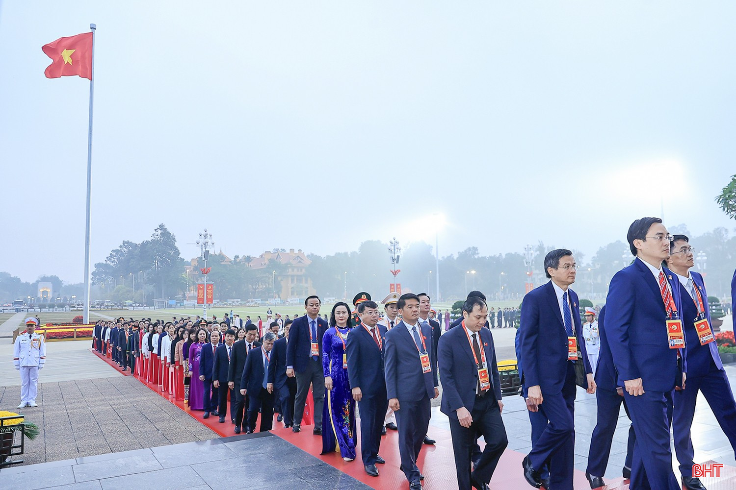 Tổng Bí thư Tô Lâm, Chủ tịch nước Lương Cường, Thủ tướng Chính phủ Phạm Minh Chính, Chủ tịch Quốc hội Trần Thanh Mẫn, Thường trực Ban Bí thư Trần Cẩm Tú và các đại biểu vào Lăng viếng Chủ tịch Hồ Chí Minh. Ảnh daihoidangtoanquoc.vn