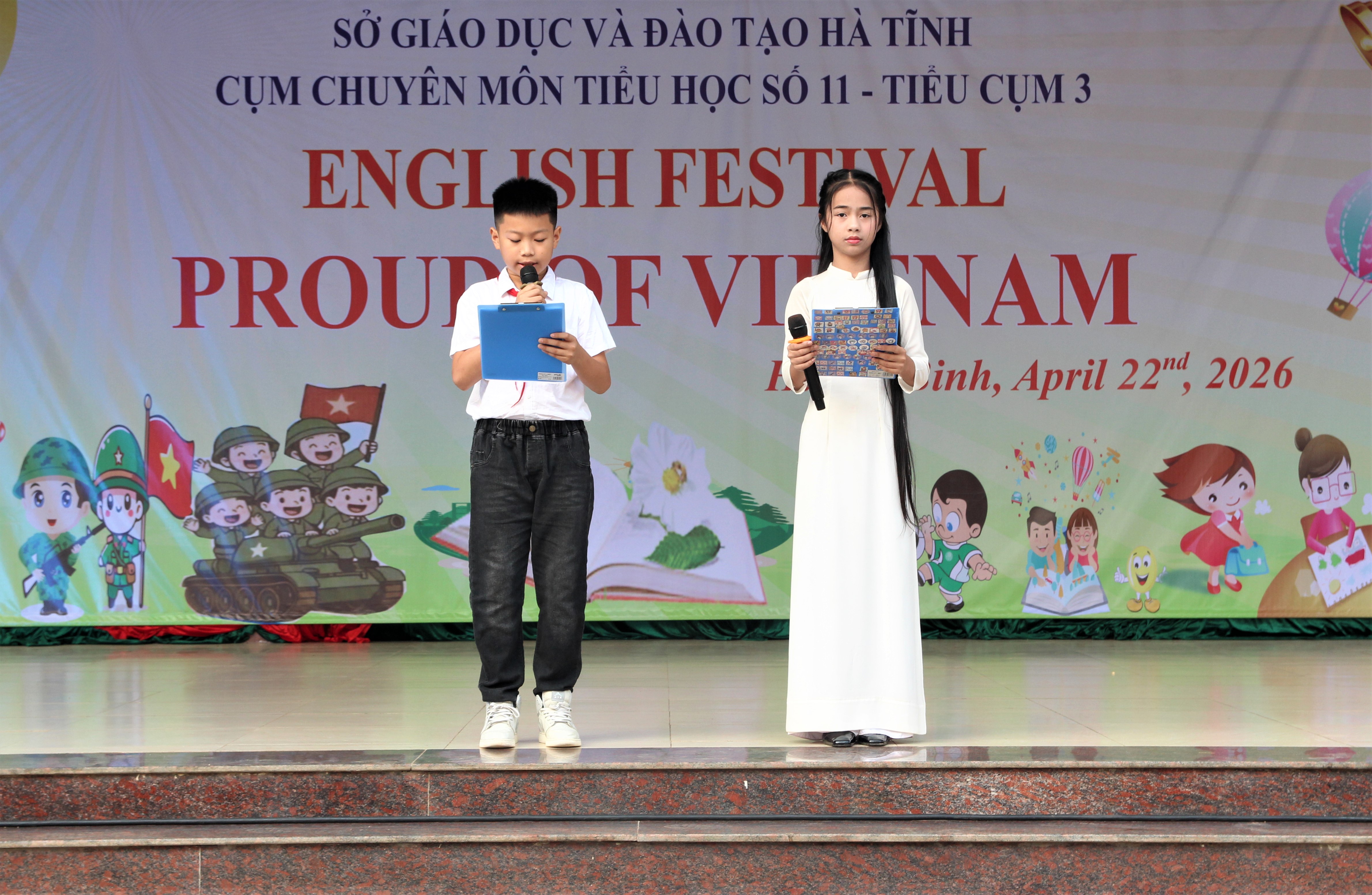 Tại chương trình, các em học sinh khối Tiểu học thuộc các trường Tiểu cụm 3 – cụm chuyên môn số 11 đã trình diễn các tiết mục kể chuyện, hùng biện, hát, diễn kịch… bằng Tiếng Anh, với nội dung xoay quanh con người, văn hóa và đất nước Việt Nam.