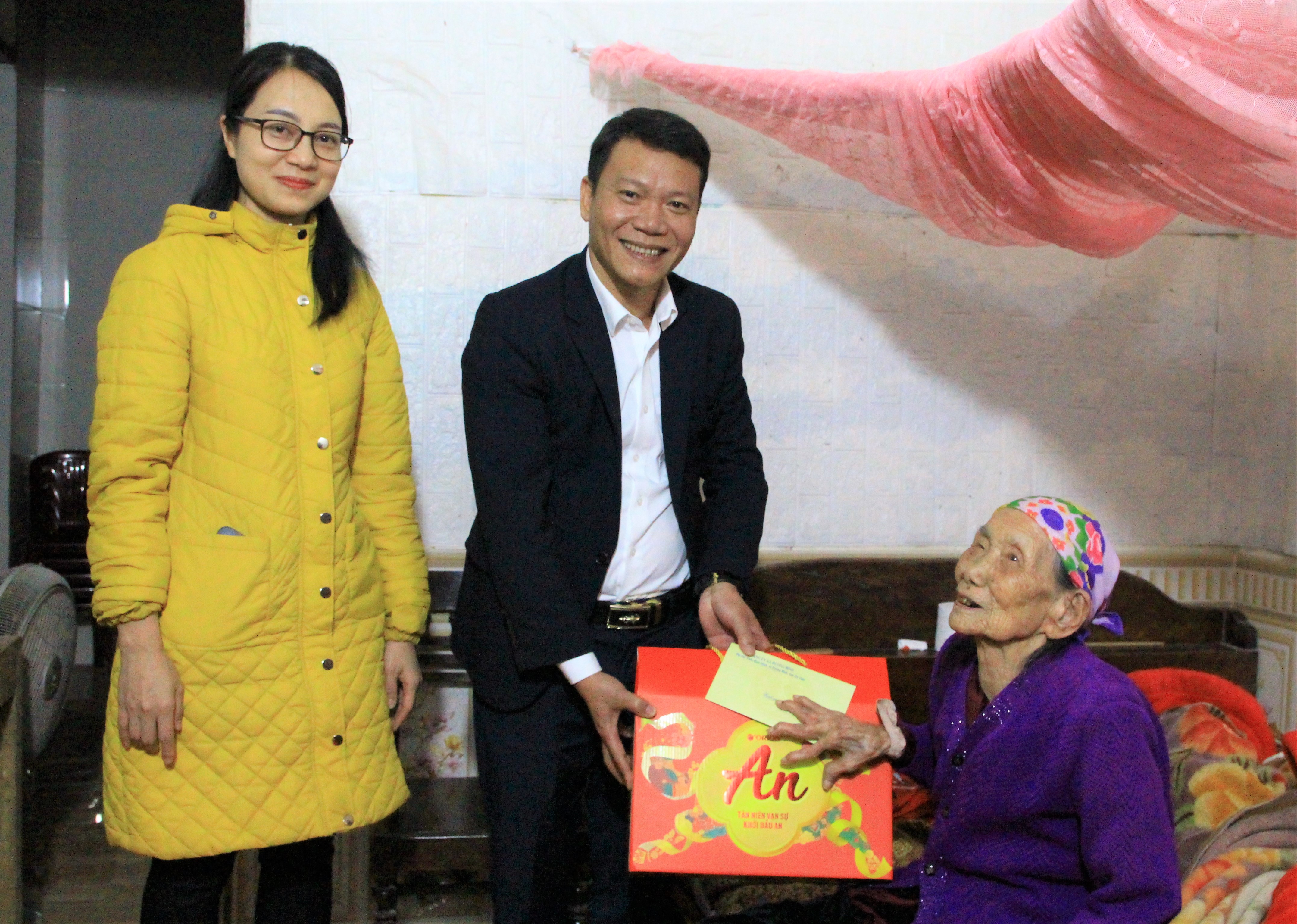 ...và đến thăm hỏi, tặng quà cho bà Trần Thị Phú trú tại thôn Bình Hải là đảng viên 76 năm tuổi Đảng.