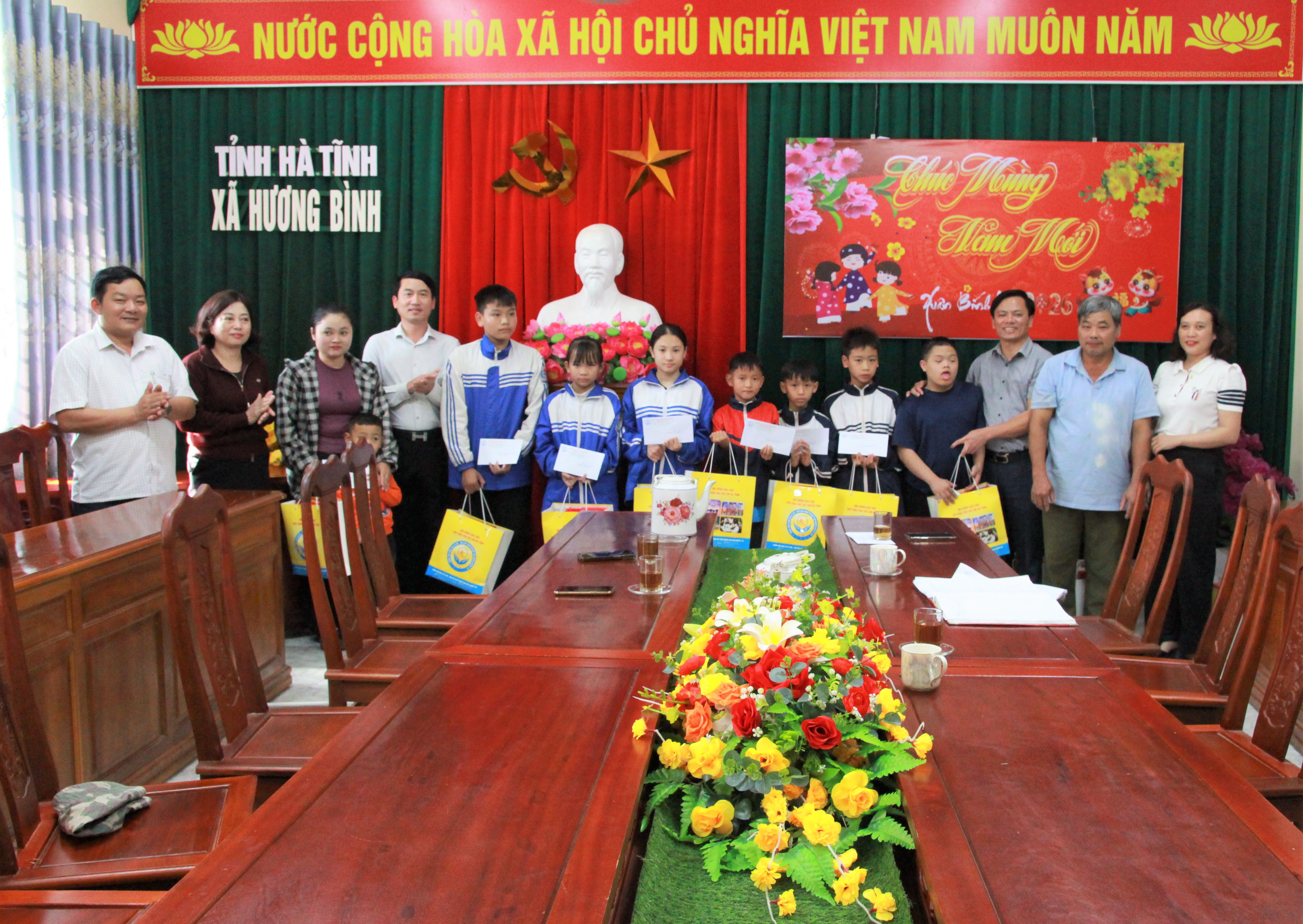 Những ngày cuối năm 2025, đầu năm 2026, Đảng ủy, HĐND, UBND và Ủy ban MTTQ xã Hương Bình đã kết nối những tấm lòng vàng. Với tinh thần "không để ai bị bỏ lại phía sau", chính quyền địa phương đã cùng các đơn vị, tổ chức và cá nhân hảo tâm huy động được nguồn lực ấn tượng, trao tặng 1.934 suất quà nghĩa tình tận tay người dân với tổng giá trị quà tặng lên đến 870 triệu đồng cho các hộ nghèo, hộ cận nghèo, gia đình chính sách, có hoàn cảnh đặc biệt khó khăn, người đau ốm, bệnh tật và những em học sinh nghèo vượt khó trên địa bàn.