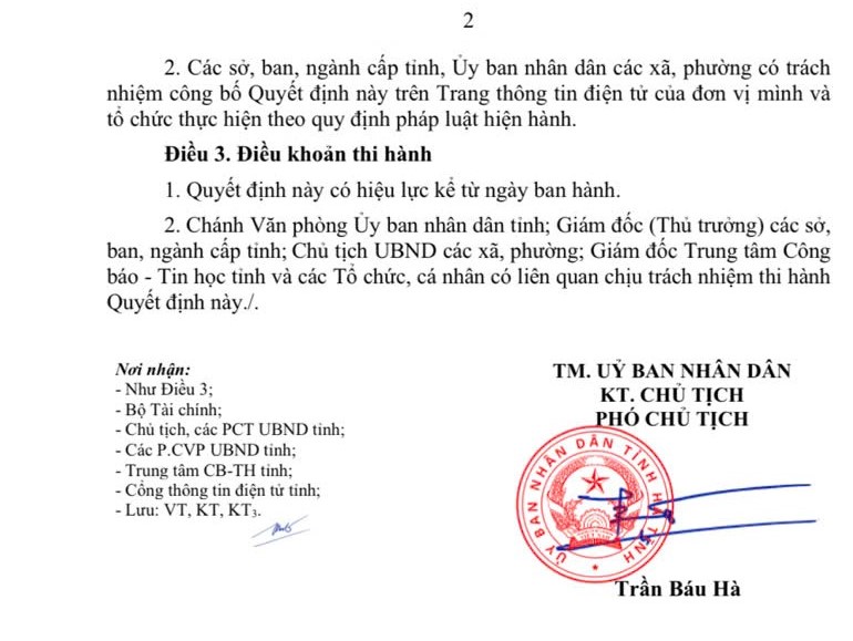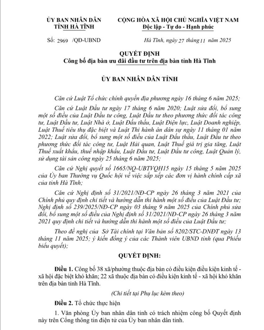 Theo Quyết định số 2969/QĐ-UBND ngày 27/11/2025 của UBND tỉnh Hà Tĩnh do Phó Chủ tịch UBND tỉnh Hà Tĩnh Trần Báu Hà ký quyết định Công bố địa bàn ưu đãi đầu tư trên địa bàn tỉnh Hà Tĩnh.