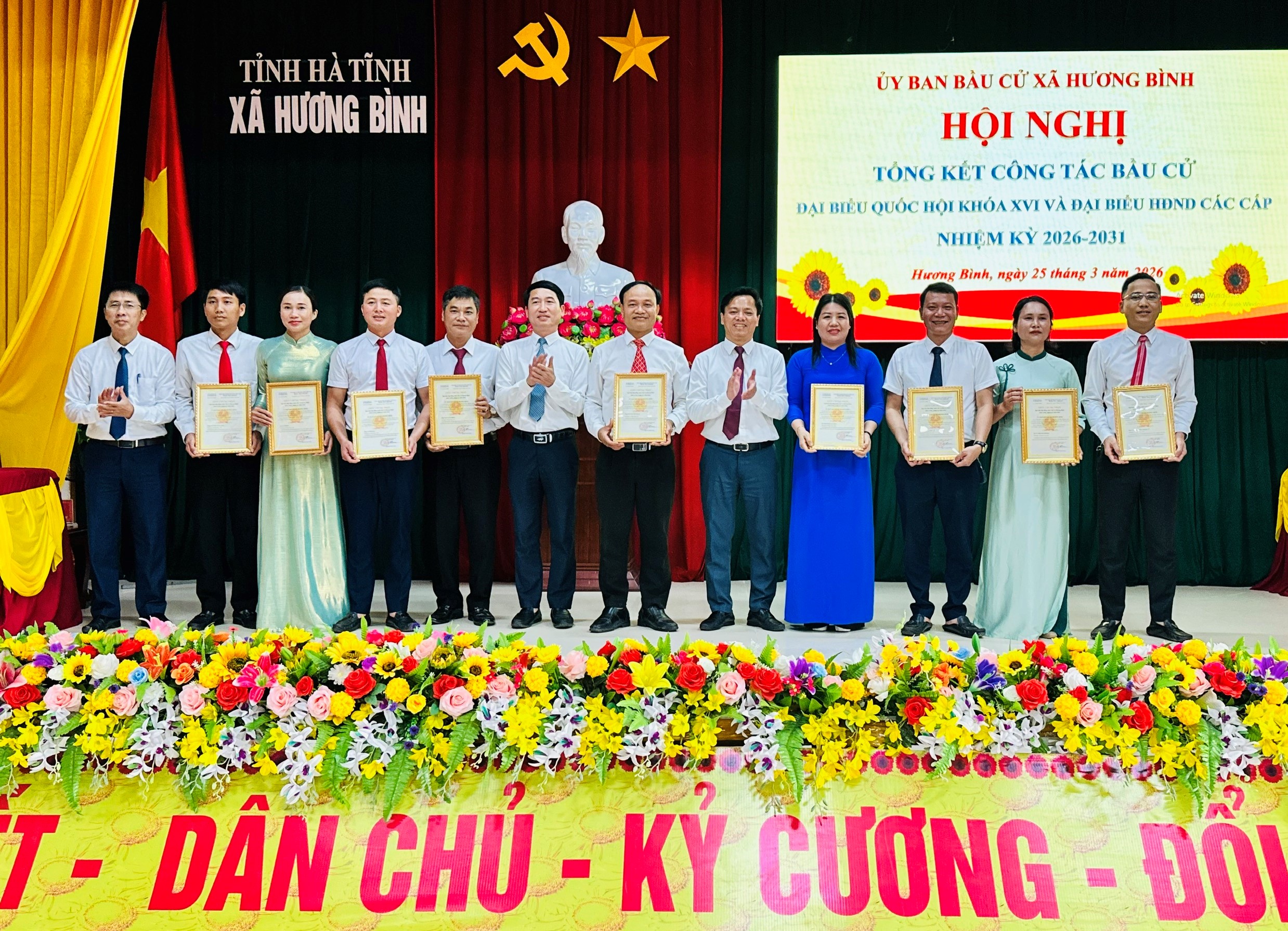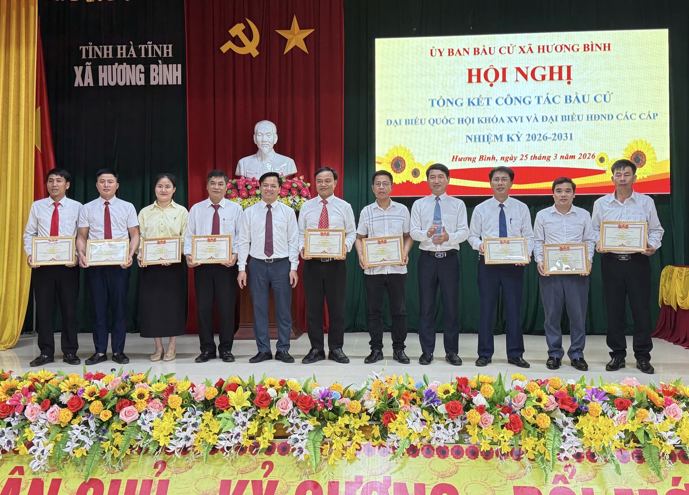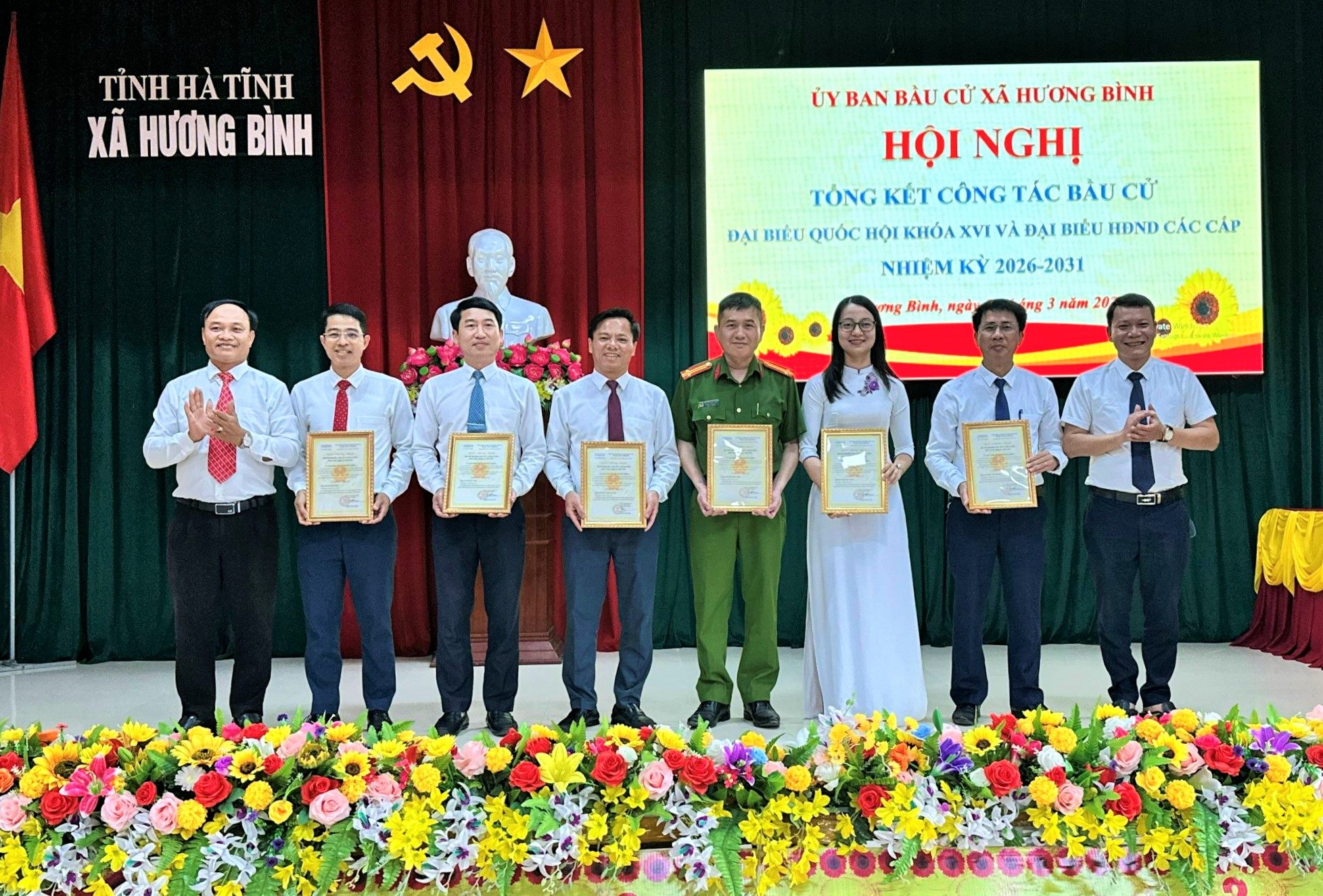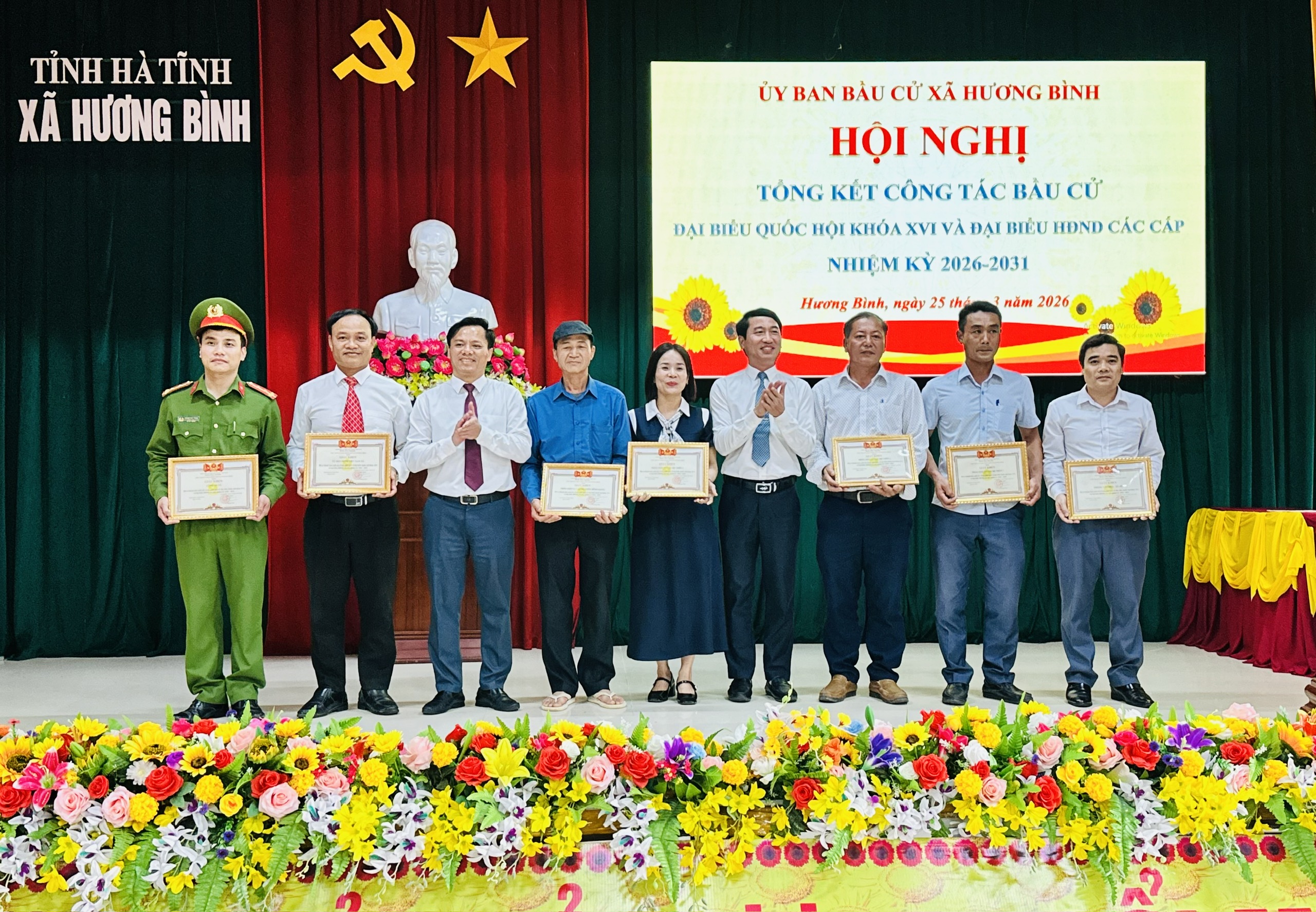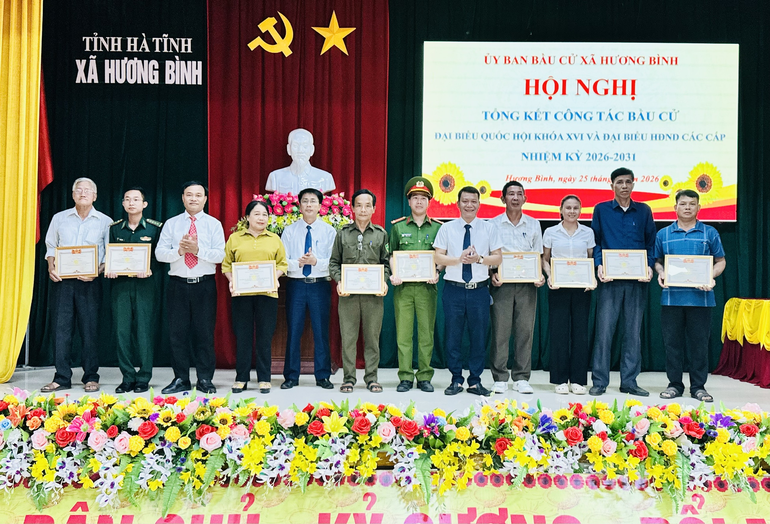 Nhân dịp này, xã Hương Bình đã tặng Giấy khen cho 7 tập thể, 20 cá nhân có thành tích xuất sắc trong công tác bầu cử đại biểu Quốc hội và HĐND các cấp, nhiệm kỳ 2026 – 2031.
