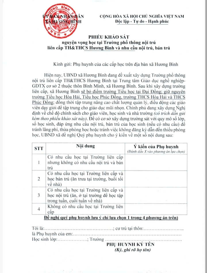 Phụ huynh có thể lựa chọn 1 trong 4 phương án phù hợp để UBND xã Hương Bình lựa chọn, đề xuất xây dựng Trường phổ thông nội trú liên cấp Tiểu học và Trung học cơ sở Hương Bình phù hợp với thực tiễn.