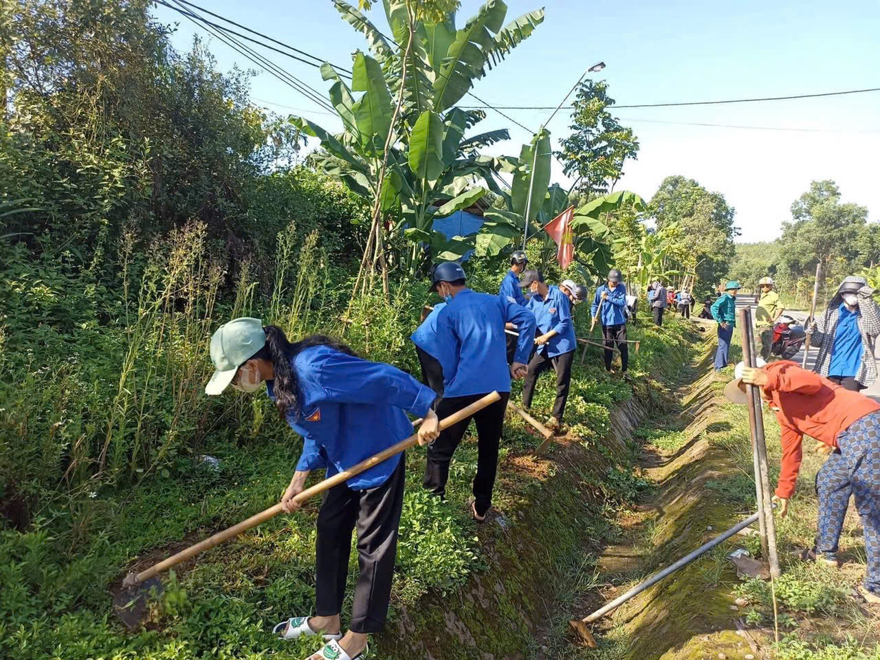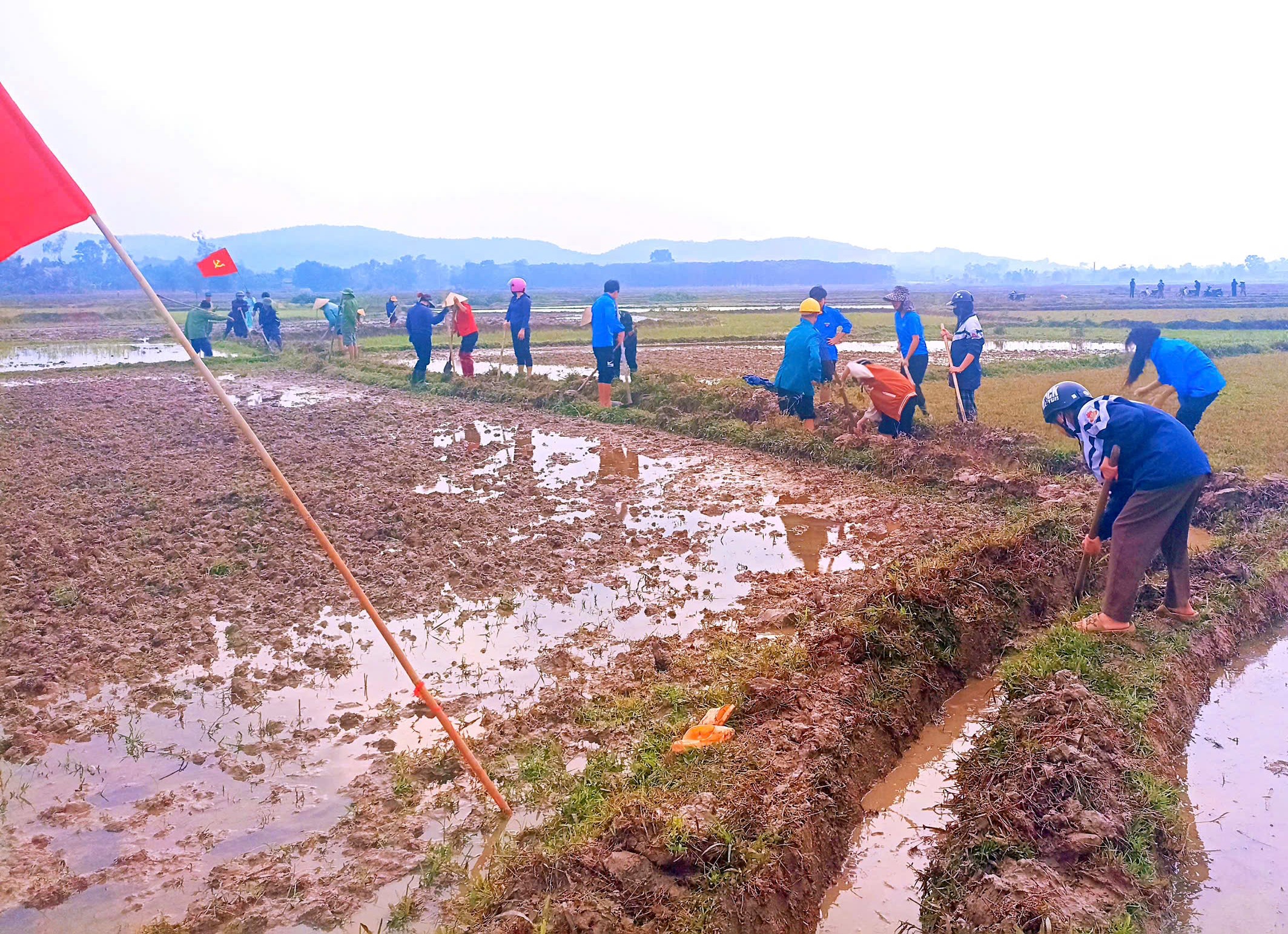 Đoàn viên thanh niên xã Hương Bình đồng hành cùng bà con nhân dân ra đồng làm giao thông thủy lợi nội đồng.