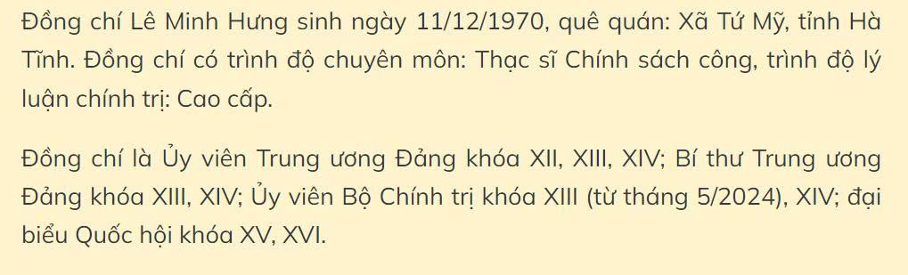 Như vậy, theo Nghị quyết được thông qua, đồng chí Lê Minh Hưng - Ủy viên Bộ Chính trị, Bí thư Trung ương Đảng, Trưởng ban Tổ chức Trung ương, đại biểu Quốc hội khóa XVI được bầu giữ chức Thủ tướng Chính phủ nước Cộng hòa xã hội chủ nghĩa Việt Nam nhiệm kỳ 2026-2031.