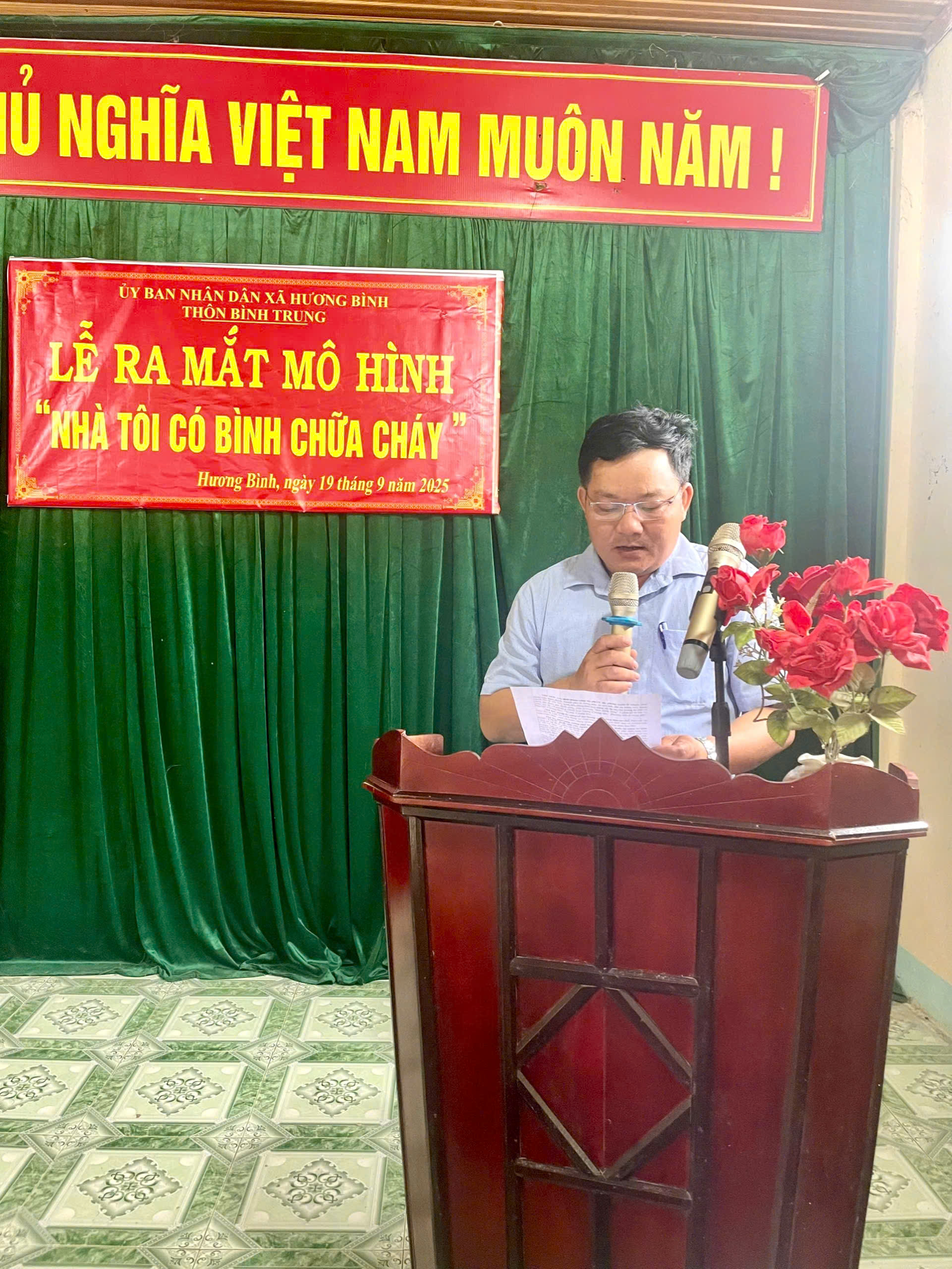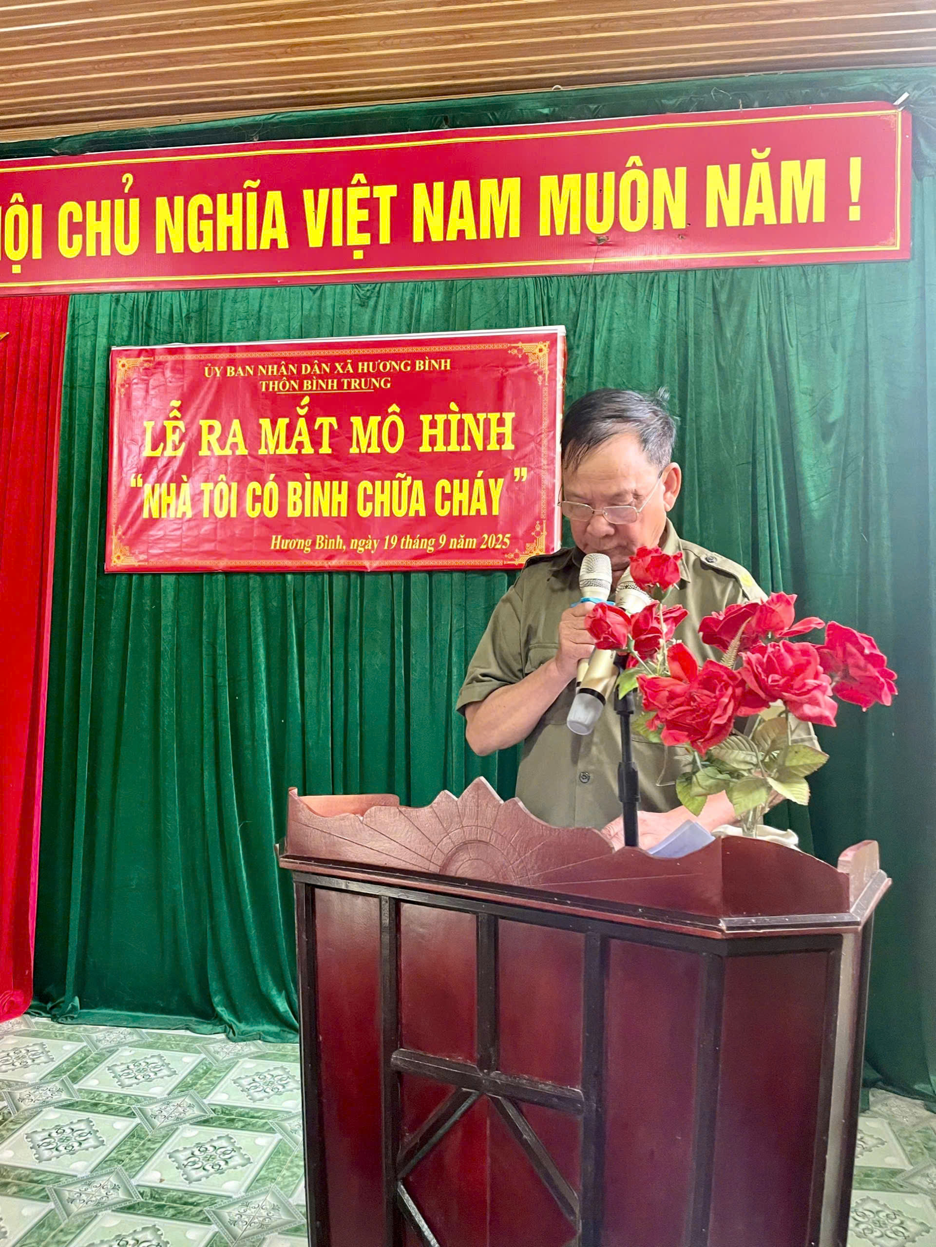 Nhằm hưởng ứng "Ngày toàn dân phòng cháy, chữa cháy, cứu nạn, cứu hộ 04/10/2025", chiều ngày 20/9/2025, tại thôn Bình Trung, Công an xã Hương Bình phối hợp với UBND xã tổ chức lễ ra mắt mô hình “Nhà tôi có bình chữa cháy”, thu hút sự tham gia đông đảo của cấp ủy, chính quyền địa phương và bà con nhân dân trên địa bàn.