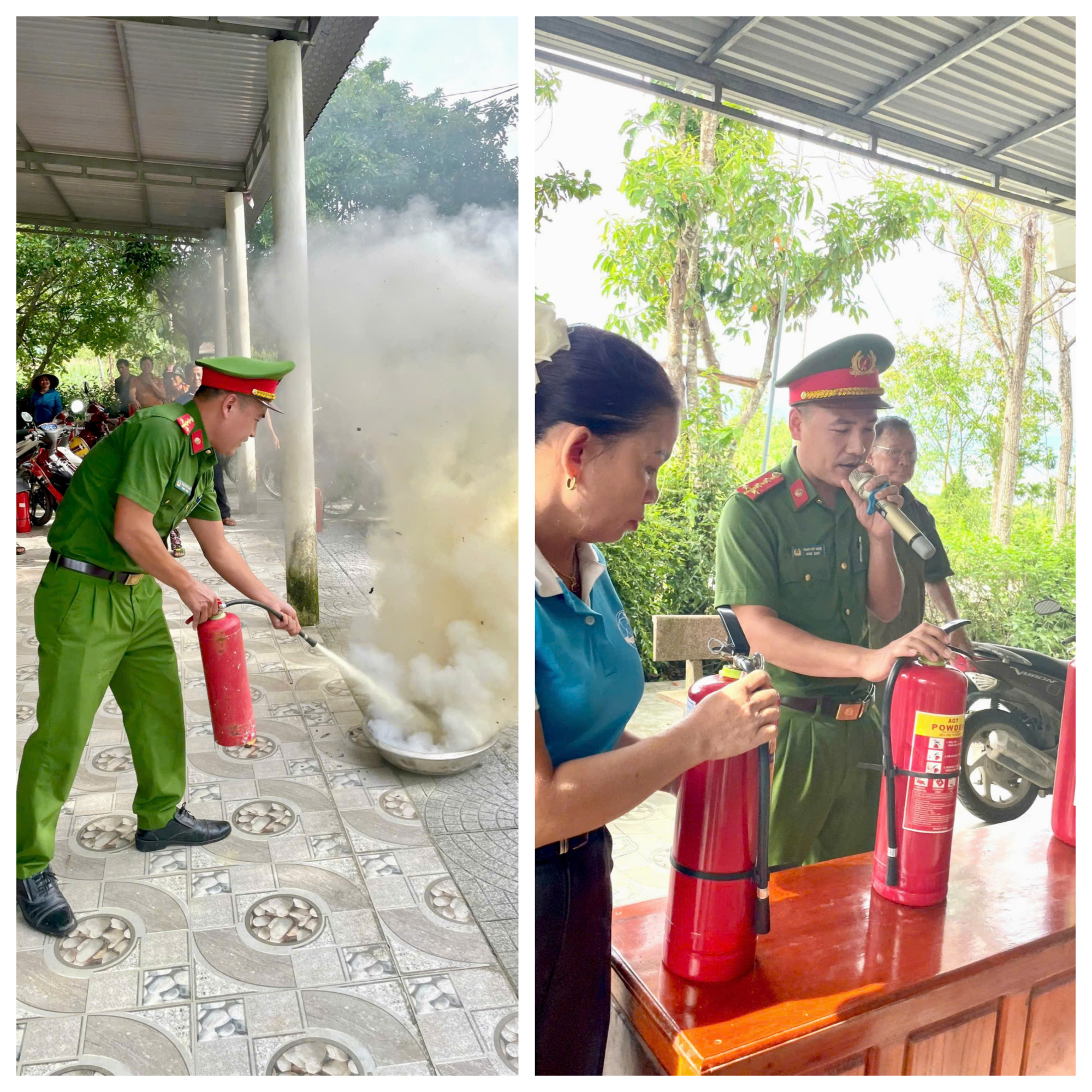 Ảnh: Công an xã Hương Bình hướng dẫn người dân sử dụng bình chữa cháy