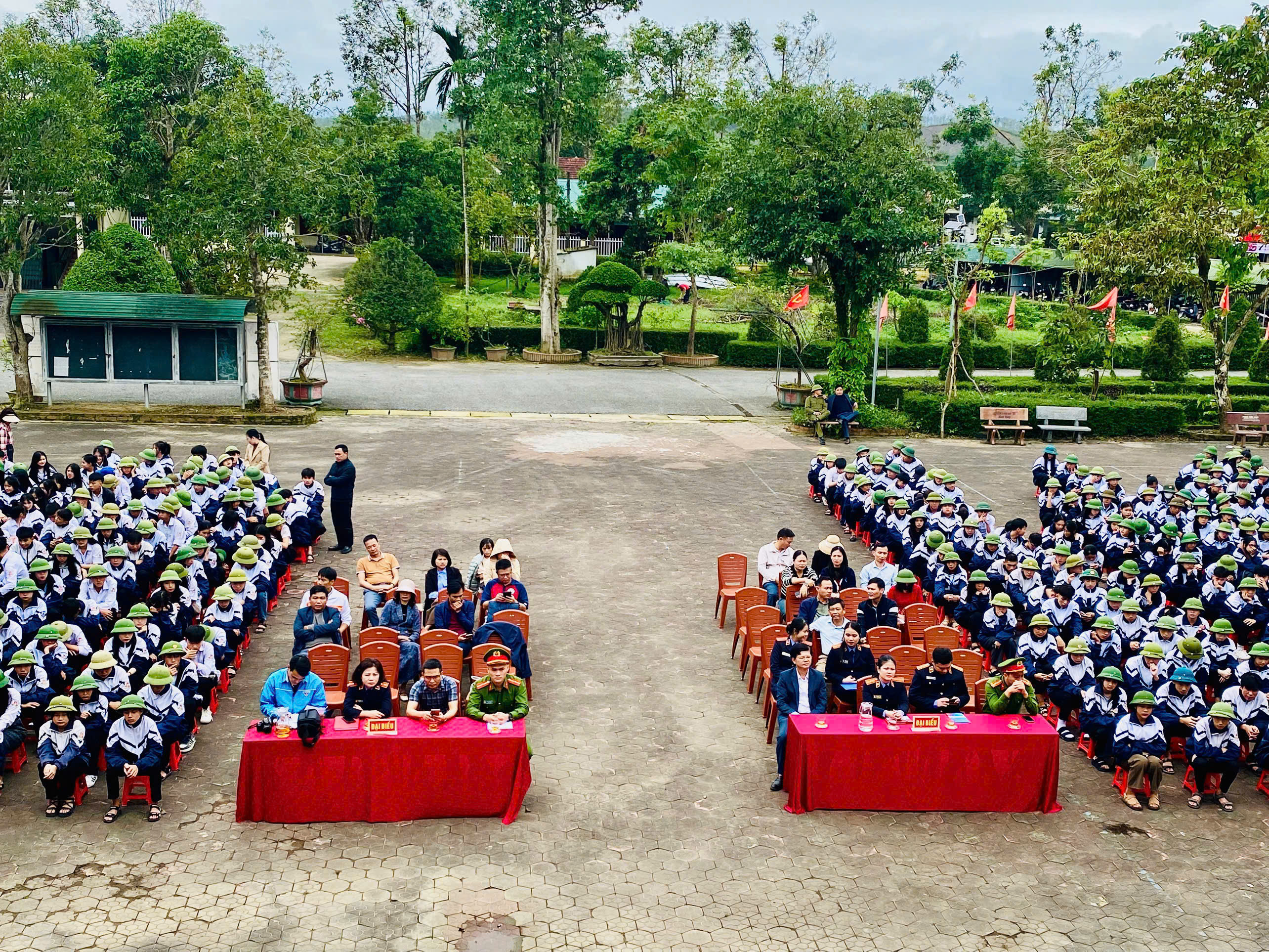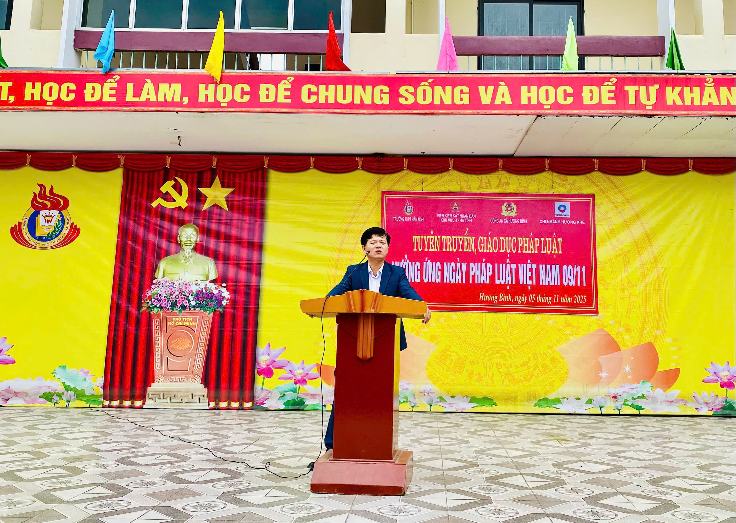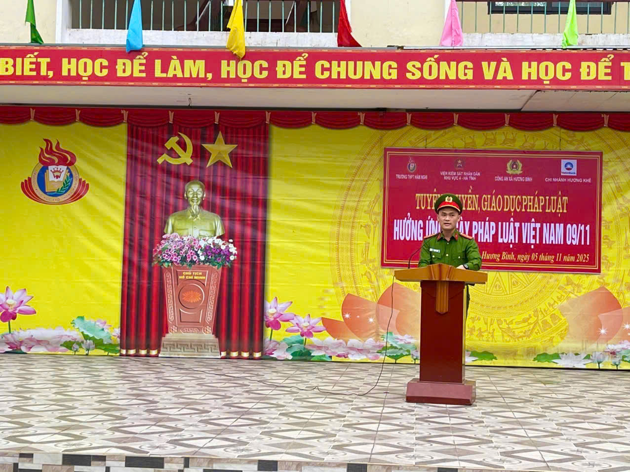 Hưởng ứng ngày pháp luật Việt Nam 09/11 và nâng cao nhận thức, ý thức chấp hành pháp luật cho thanh thiếu niên, chiều ngày 05/11/2025, Công an xã Hương Bình phối hợp Viện kiểm sát nhân dân Khu vực IV, trường THPT Hàm Nghi tổ chức buổi tuyên truyền, phổ biến pháp luật về một số hành vi Bạo lực học đường và An ninh, an toàn trên không gian mạng tại trường THPT Hàm Nghi.
