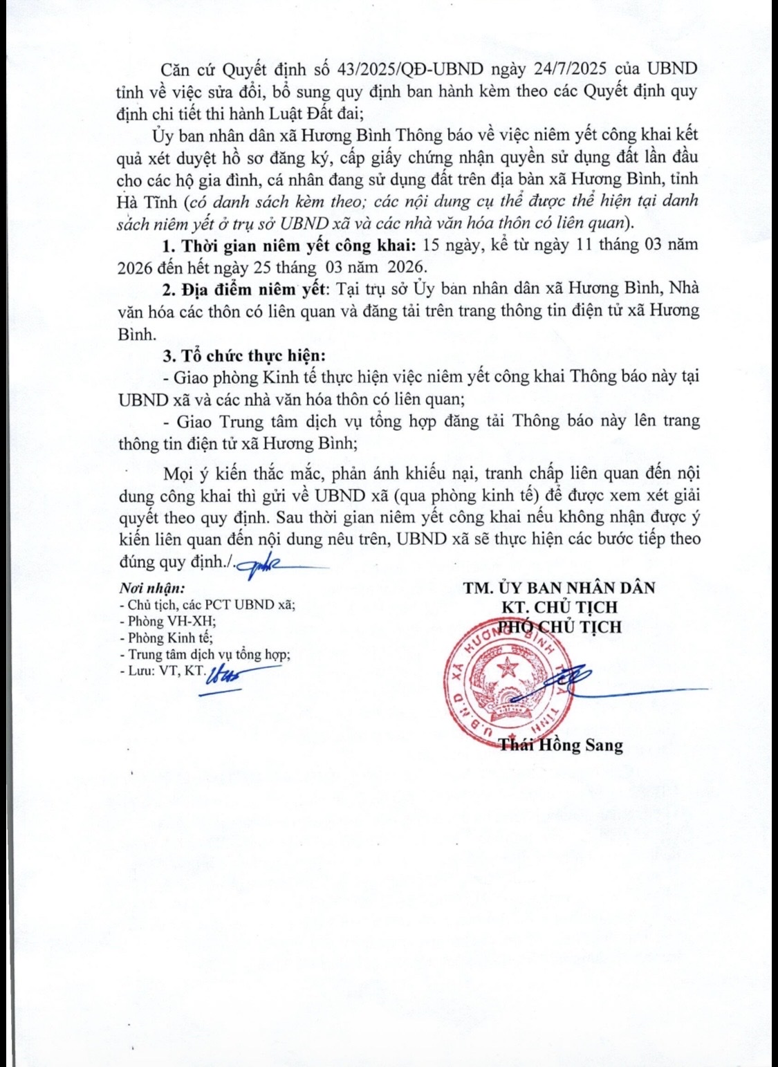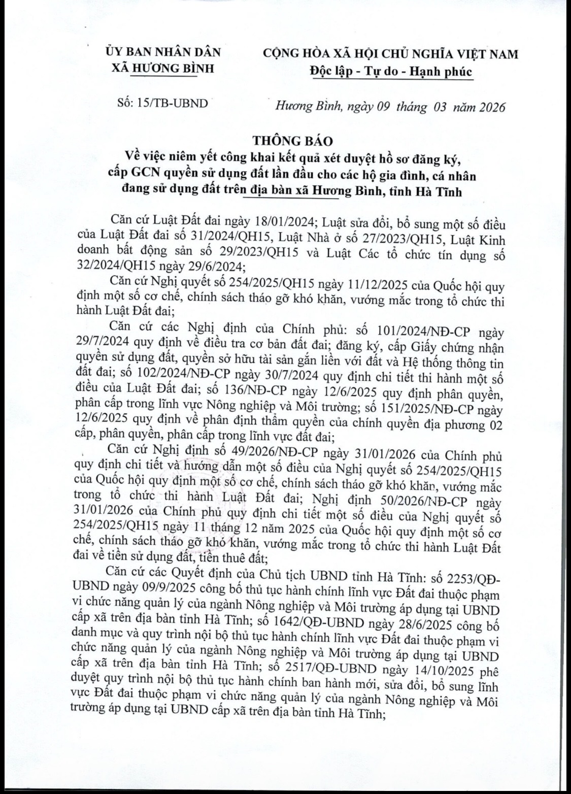 Ngày 9/3/2026, UBND xã Hương Bình (Hà Tĩnh) có thông báo số 15/TB-UBND Về việc niêm yết công khai kết quả xét duyệt hồ sơ đăng ký, cấp GCN quyền sử dụng đất lần đầu cho các hộ gia đình, cá nhân đang sử dụng đất trên địa bàn xã Hương Bình, tỉnh Hà Tĩnh.