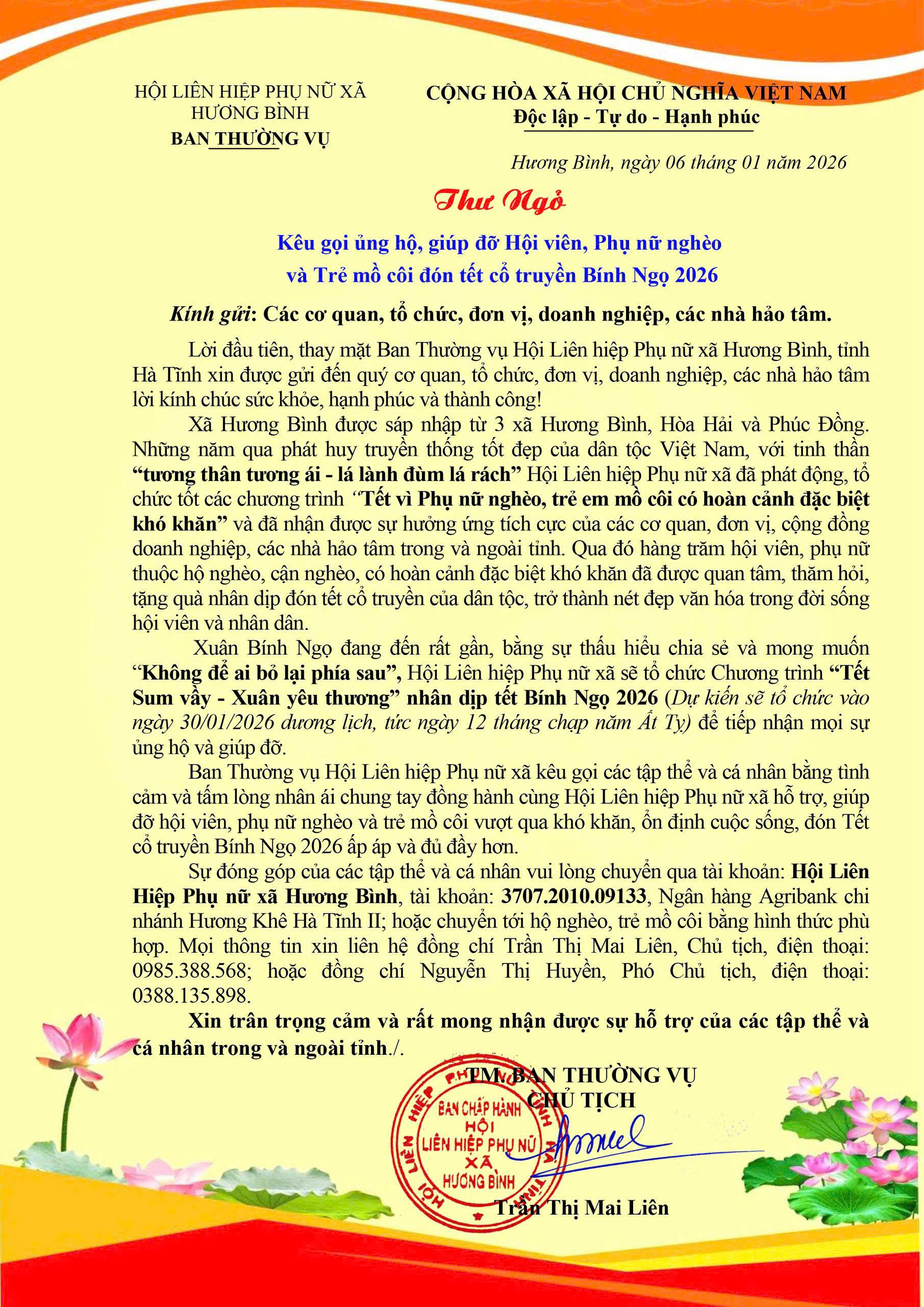 Ban Thường vụ Hội Liên hiệp Phụ nữ xã kêu gọi các tập thể và cá nhân bằng tình cảm và tấm lòng nhân ái chung tay đồng hành cùng Hội Liên hiệp Phụ nữ xã hỗ trợ, giúp đỡ hội viên, phụ nữ nghèo và trẻ mồ côi vượt qua khó khăn, ổn định cuộc sống, đón Tết cổ truyền Bính Ngọ 2026 ấp áp và đủ đầy hơn.