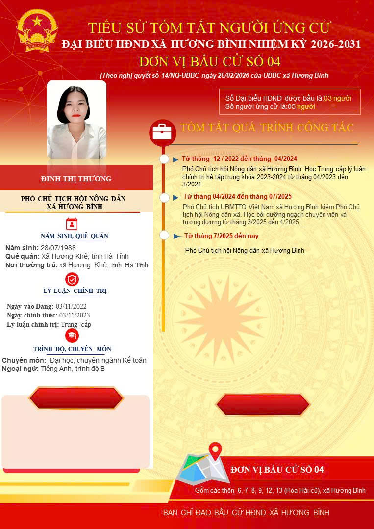Trang thông tin điện tử xã Hương Bình xin trân trọng giới thiệu tiểu sử tóm tắt của bà Đinh Thị Thương, Phó Chủ tịch Hội nông dân xã Hương Bình, tỉnh Hà Tĩnh.