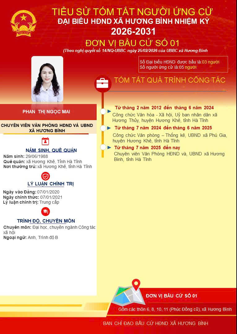 Trang thông tin điện tử xã Hương Bình Tóm tắt tiểu sử bà Phan Thị Ngọc Mai, Chuyên viên Văn phòng HĐND và UBND xã Hương Binh, là người ứng cử viên Đại biểu HĐND xã Hương BÌnh, nhiệm kỳ 2026 - 2031.