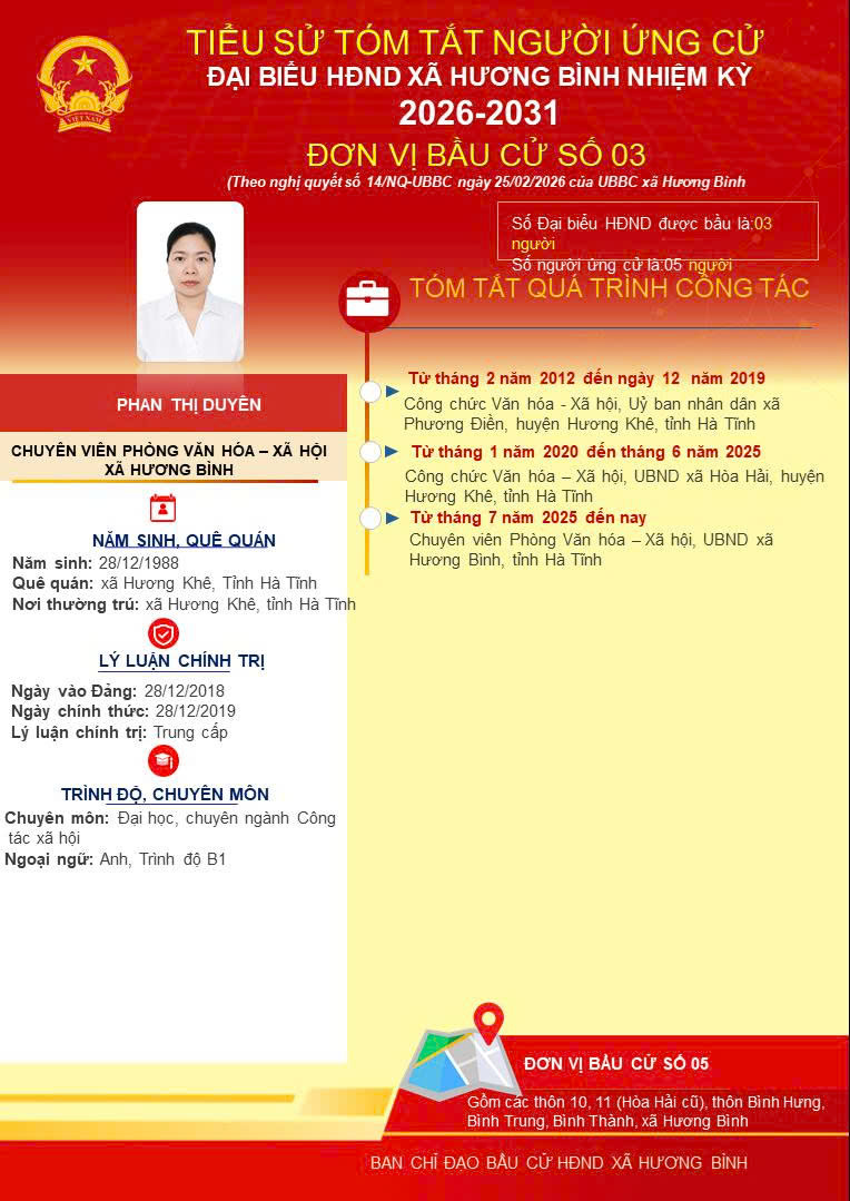Trang thông tin điện tử xã Hương Bình xin trân trọng giưới thiệu tóm tắt tiểu sử của bà Phan Thị Duyên, Chuyên viên pHòng Văn hóa - Xã hội xã Hương Bình, là người ứng cử viên Đại biểu HĐND xã Hương BÌnh, nhiệm kỳ 06 - 2031.