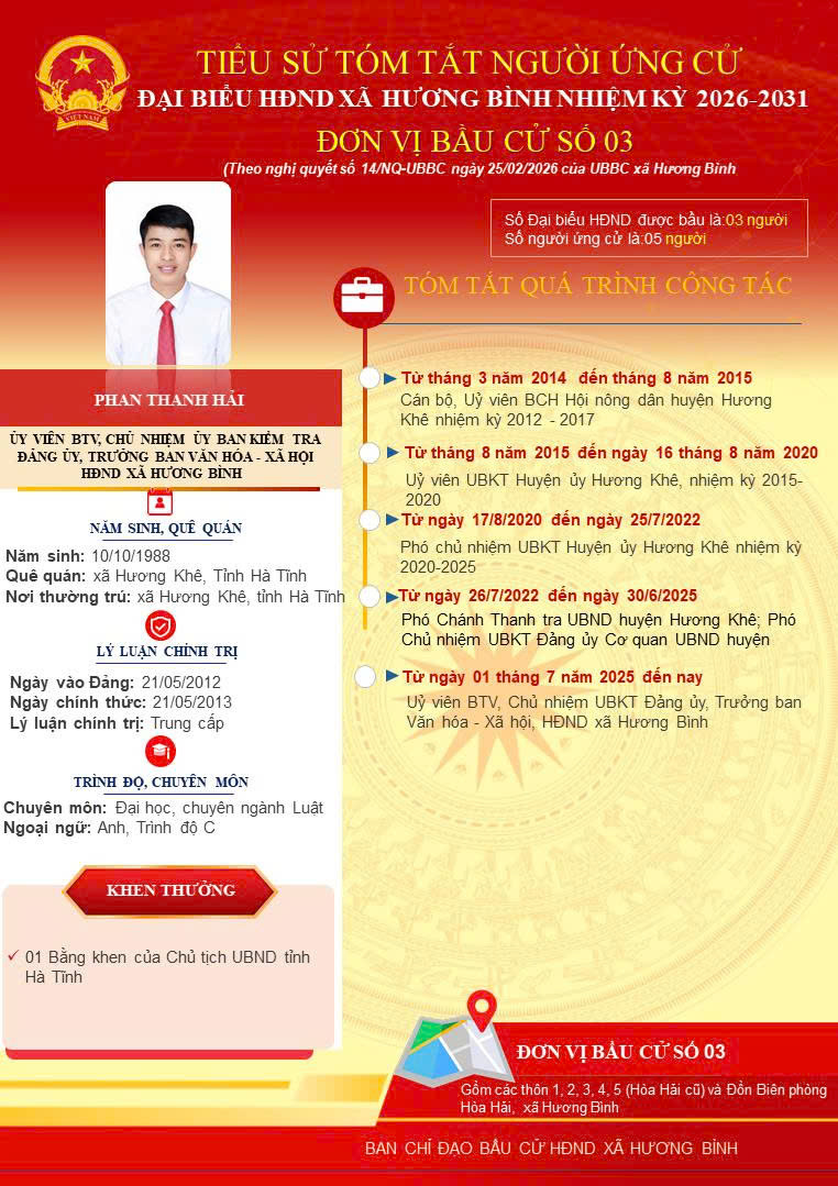 Trang thông tin điện tử xã Hương Bình xin trân trọng giới thiệu tiểu sử tóm tắt của ông Phan Thanh Hải Ủy viên BTV Đảng ủy, Chủ nhiệm Ủy ban Kiểm tra Đảng ủy xã Hương Bình nhiệm kỳ 2021 - 2026 là người ứng cử đại biểu HĐND xã Hương Bình, nhiệm kỳ 2026 - 2031.
