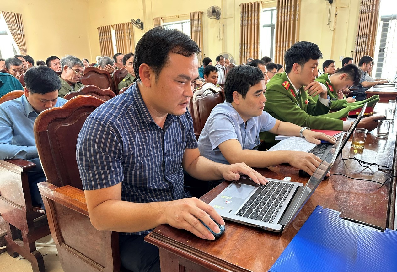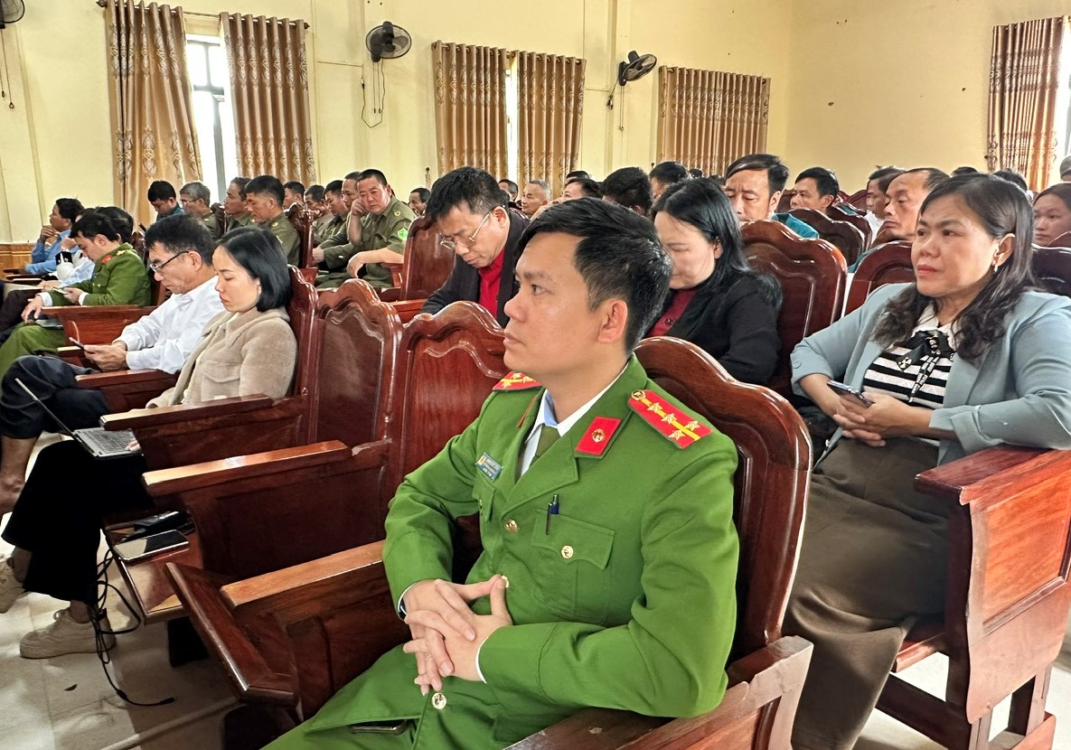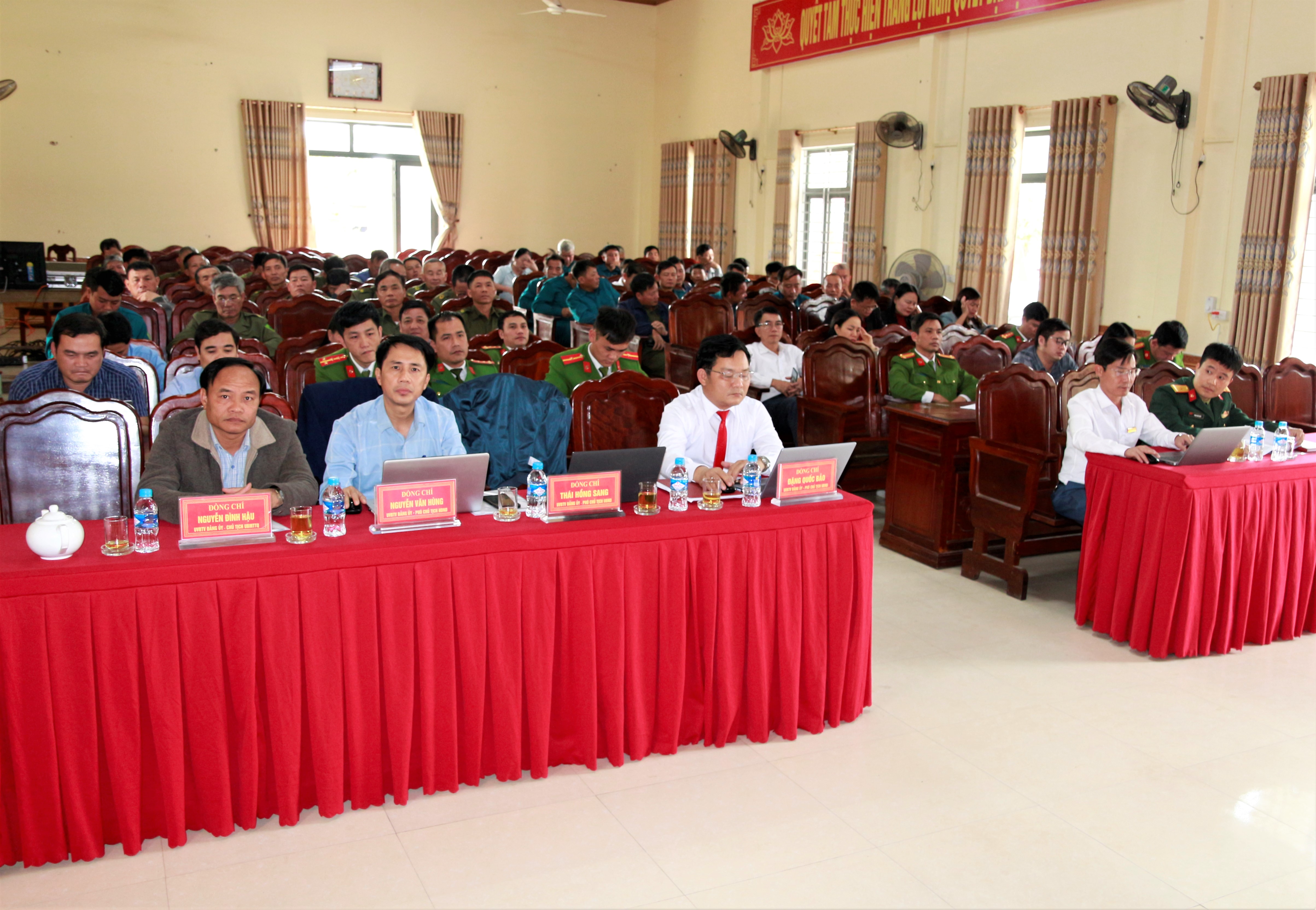 Các đồng chí Lê Quang Vinh – Phó Bí thư Đảng ủy, Chủ tịch UBND xã; Trần Kiên Hạnh - Chỉ huy trưởng Ban chỉ huy Quân sự xã; Trung tá Nguyễn Hồng Sơn - Trưởng Công an xã Hương Bình chủ trì hội nghị.
