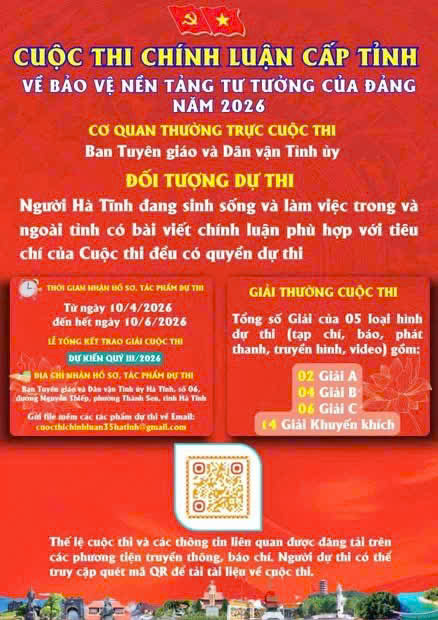- Cơ quan Thường trực Cuộc thi sẽ nhận bài dự thi từ ngày 10/4/2026 cho đến hết ngày 10/6/2026 (tính theo dấu bưu điện).